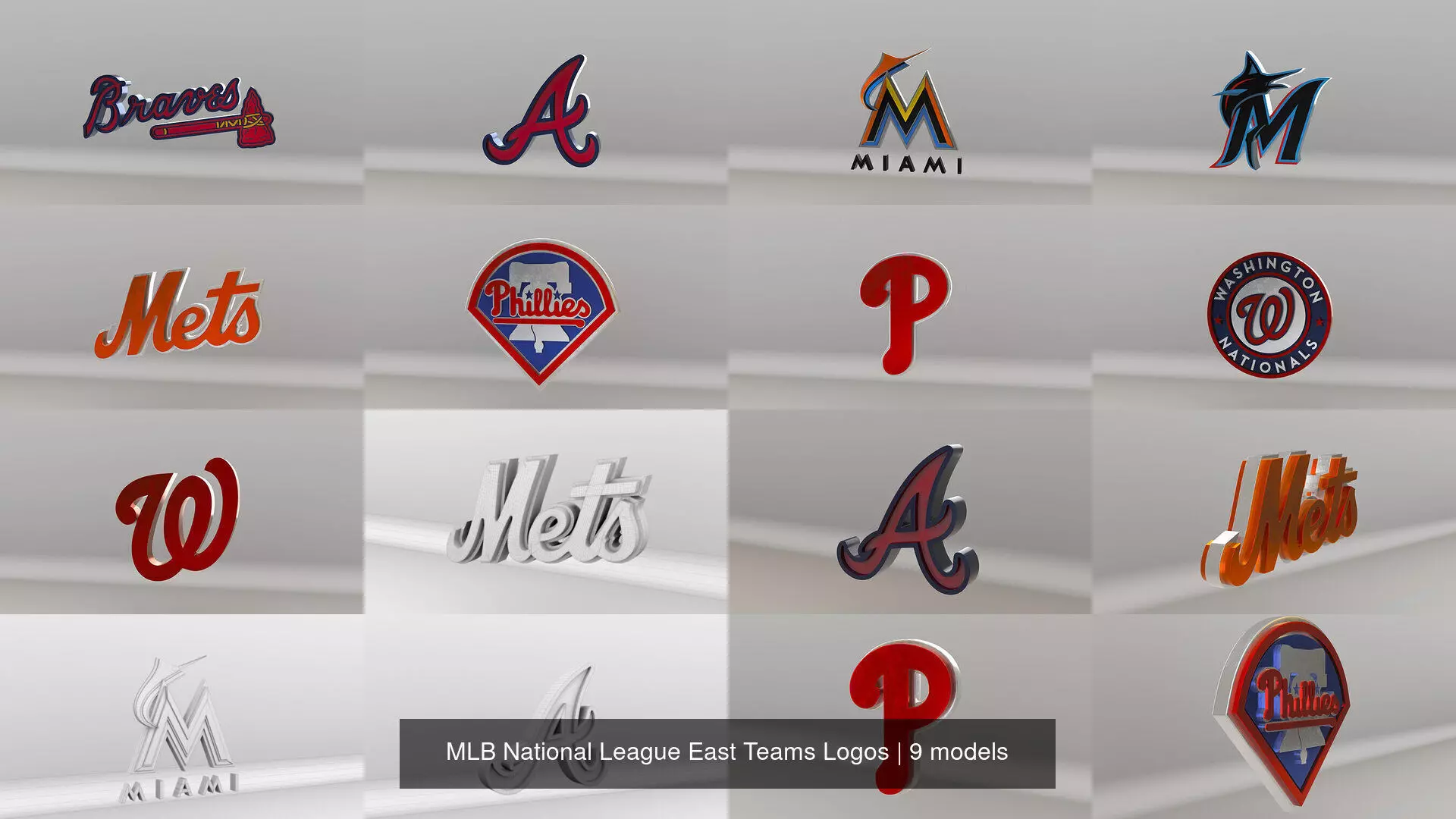 MLB National League East Teams Logos modeled and rendered in Maya using Redshift and textured in Substance Painter. It contains PBR Textures. The renders are using the metallic texture, but if you don't use it you have the logo with it's original color, like the last picture.