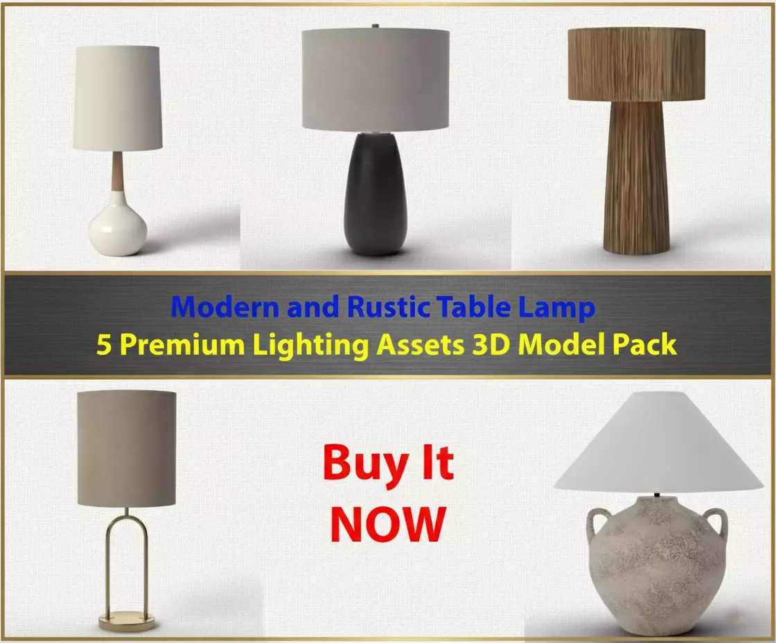 Enhance your interior architectural visualizations with this versatile collection of 5 high-quality table lamp 3D models. This pack features a curated mix of rustic, ceramic, and sleek metal finishes, designed to fit seamlessly into modern, minimalist, or bohemian interior scenes.