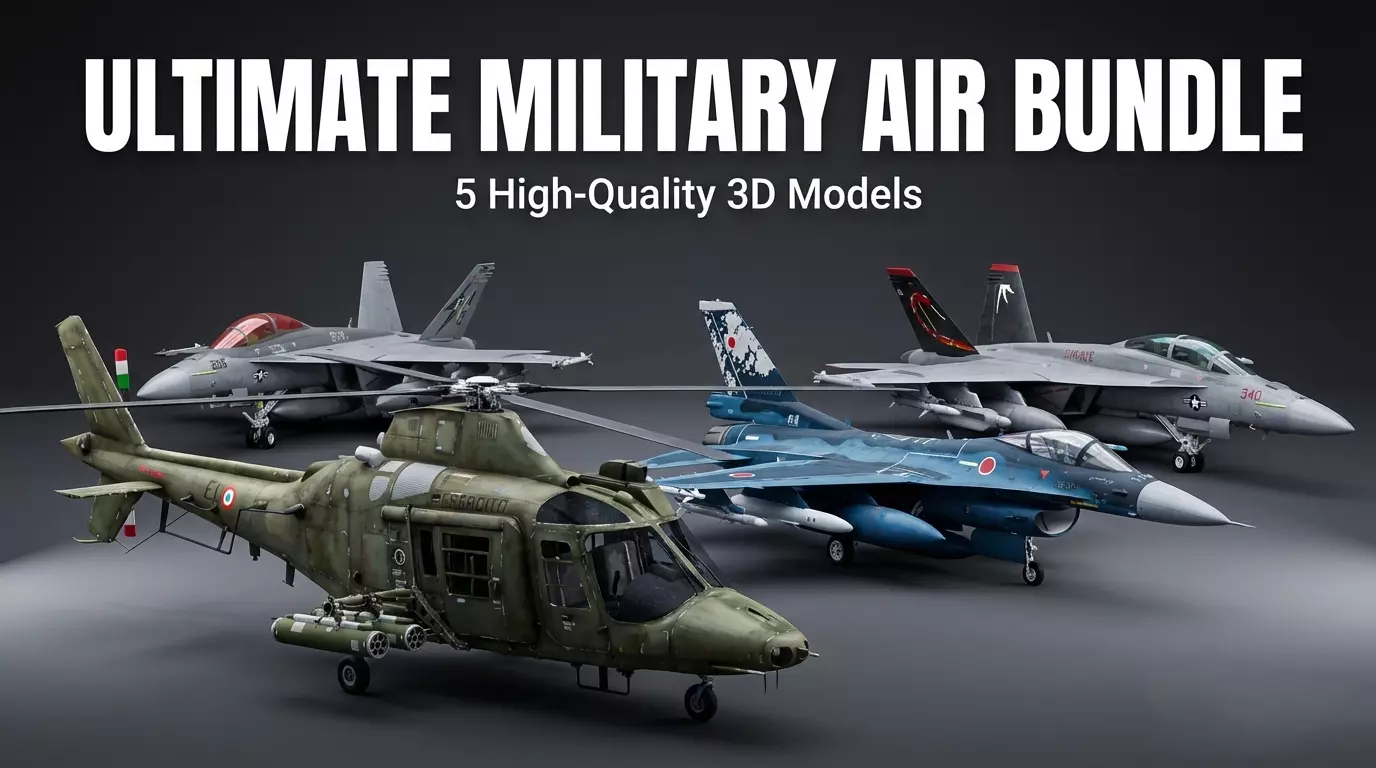 Dominate the skies with this premium modern combat aircraft bundle. Features five cutting-edge fighter jets and helicopters from international air forces, each meticulously detailed with authentic configurations for flight simulators, military games, and aviation projects.