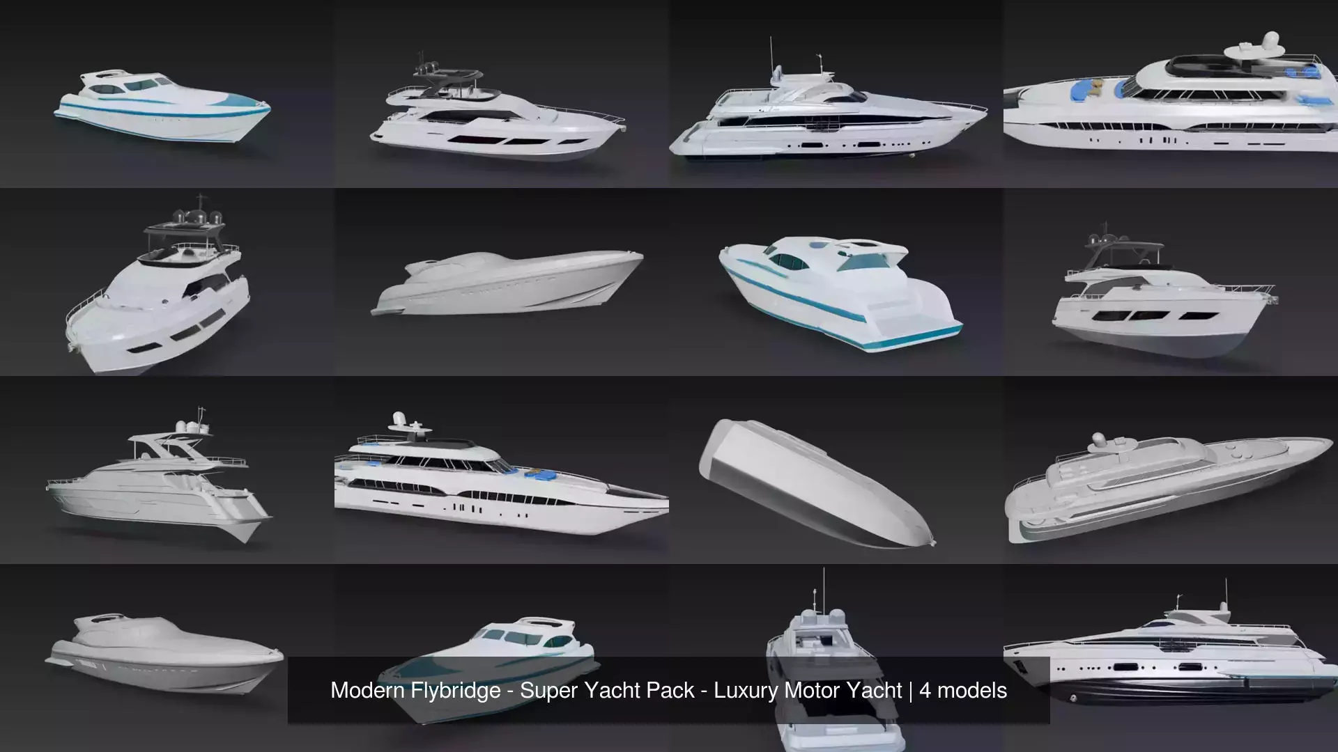 The Modern Flybridge & Super Yacht Pack is a premium 3D asset collection featuring four contemporary luxury motor yachts, including flybridge yachts, super yachts, and a modern sport express cruiser design.