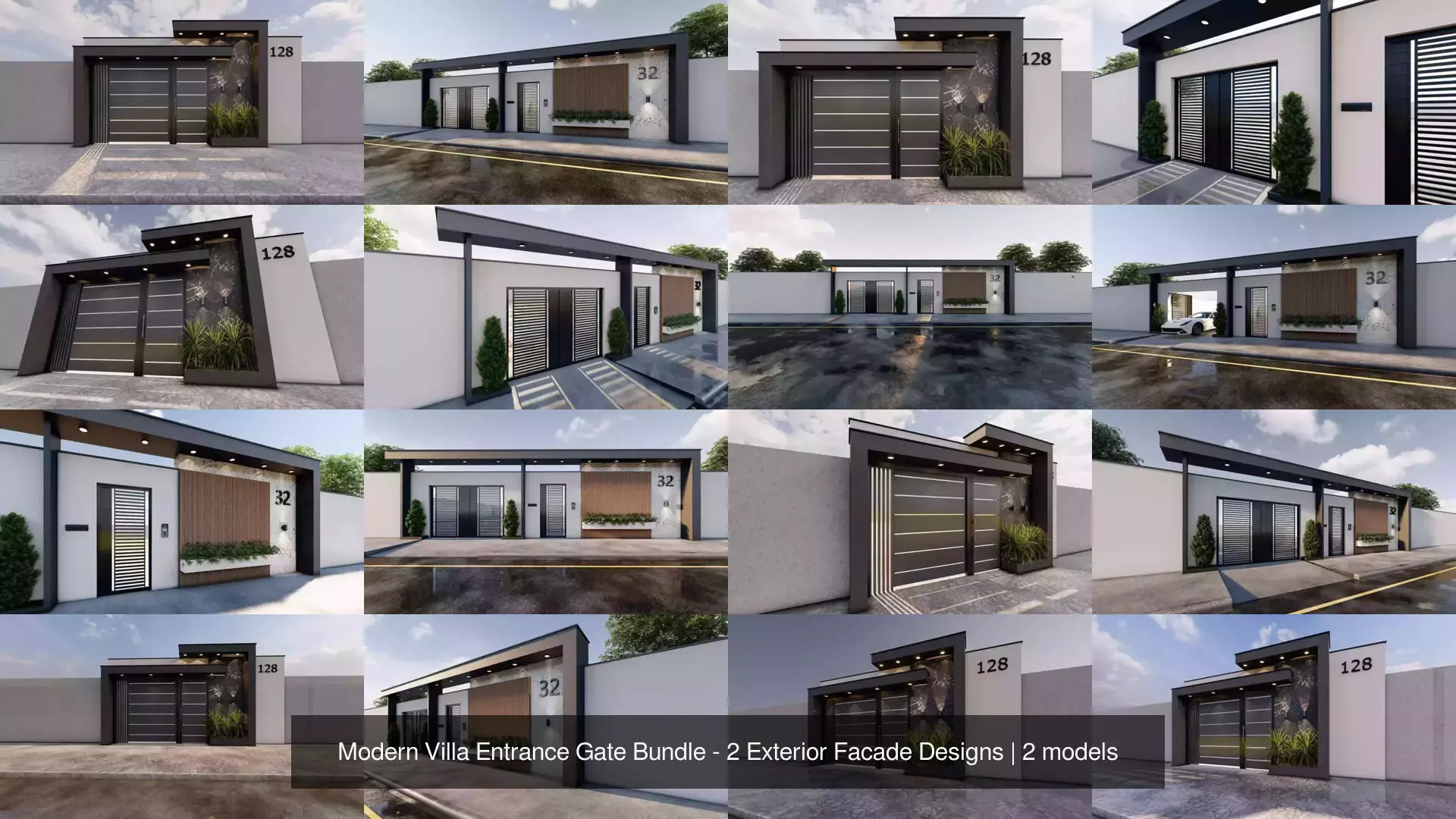 This bundle includes 2 modern villa entrance gate designs suitable for luxury residential projects, architectural visualization and exterior facade presentations.