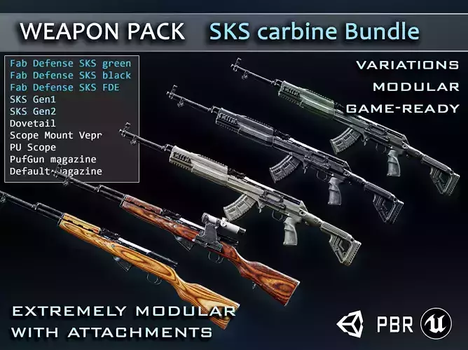 This highly detailed, realistic 3D models of the SKS semi-automatic rifle is perfect for game developers and 3D artists. Created with precision, this asset features PBR textures, ensuring stunning realism and high-quality visuals. Fully rigged and ready for animation, it’s optimized for both Unreal Engine and Unity, making it easy to integrate into your projects. Whether you're working on a first-person shooter, military simulation, or any other game involving firearms, this model will enhance the authenticity of your scenes. With its attention to detail and versatility, the SKS rifle is a must-have asset for your next project.Includes folowing assetss: SKS Gen 1, SKS Gen 2, SKS FAB Defense Black, SKS FAB Defense FDE, SKS FAB Defense GreenAttachments: Dovetail, Scope Mount Vepr, PU scope, PUFGUN magazine, Default magazine