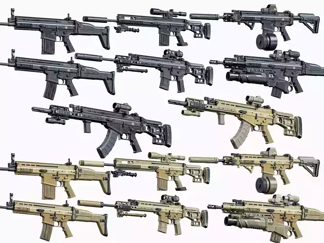 Game-Ready high-quality modular 3d model FN SCAR assault rifles for Unreal Engine, Unity and other PBR game engines, renderers, first Person Shooters, VR games, and your other projects.
