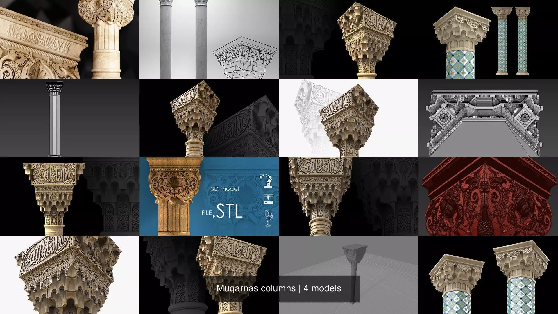 Four models of Islamic muqarnas columns that can be used in interior and exterior decorations