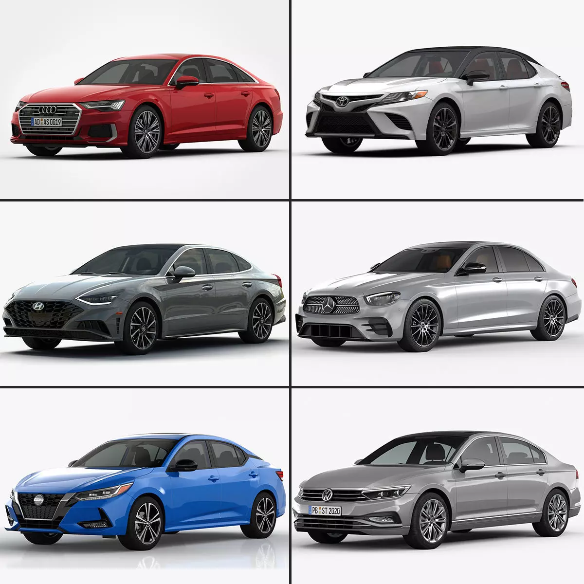 Audi A6 S-LineToyota Camry XSEHyundai SonataMercedes-Benz E-ClassNissan SentraVolkswagen PassatHigh quality models with detailed interior & exterior.