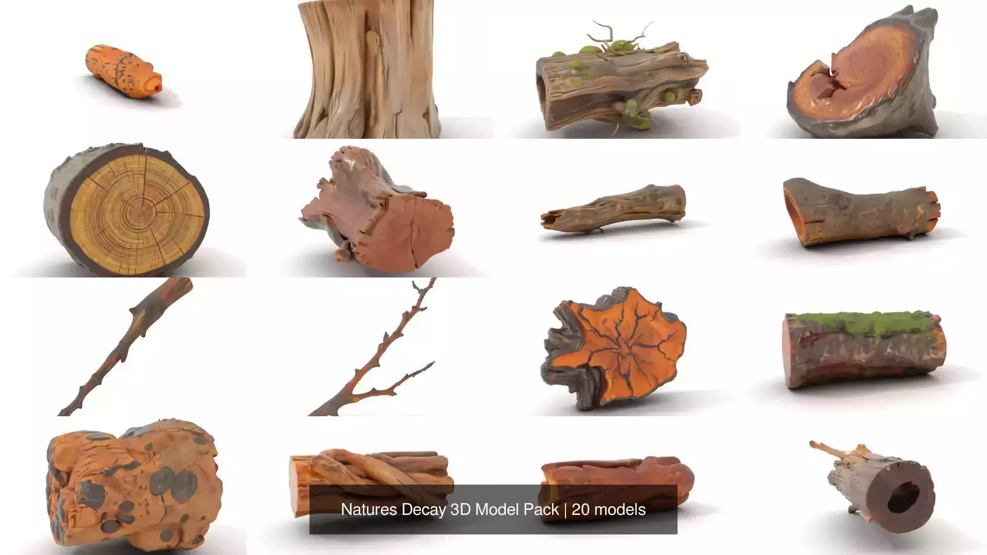 Explore the intricate beauty of decay with our 'Nature's Decay 3D Model Pack'. This collection features meticulously crafted 3D models inspired by the natural world. From aged, gnarled branches exhibiting rough textures and intricate cracks to delicate rotten tree fragments showcasing rich wood grain, this pack encapsulates the mesmerizing process of decay. Discover captivating details within decayed wood sections adorned with moss, tangled tendrils, and lichens. Weathered tree stumps and splintered log segments reveal inner wood complexities and deep grooves that tell stories of time. Whether you're admiring the raw ends of broken trunks, experiencing the curved details of damaged saplings, or exploring the natural shadows of corroded tree portions, each model presents a unique visual tale. Perfect for adding realistic, organic elements to digital art, design projects, and educational illustrations.