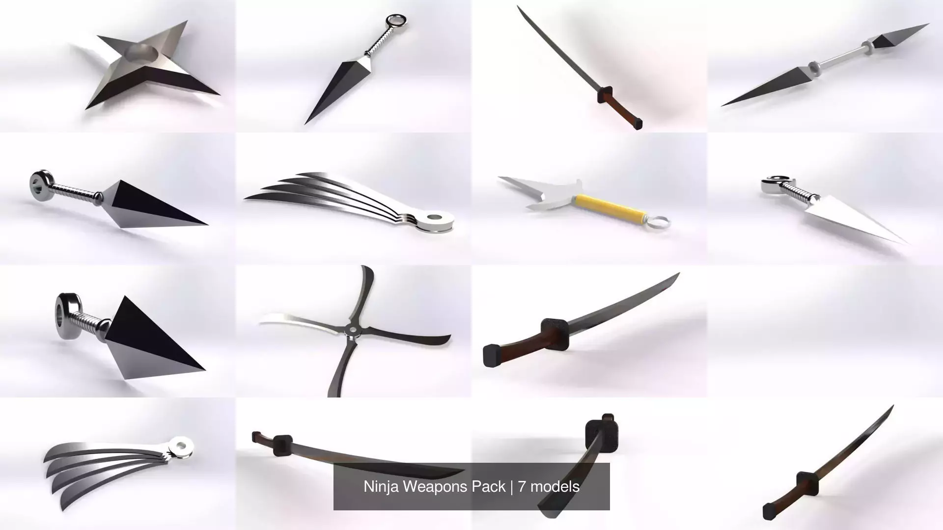 Included Models:Kunai (multiple variations)Double KunaiShuriken (throwing star)Katana swordFeatures:Game Ready (optimized topology)Low Poly modelsClean geometryLightweight and efficientEasy to use and modifyFormats:FBXOBJUse Cases:Video gamesAnimationVR / AR projectsStylized environments