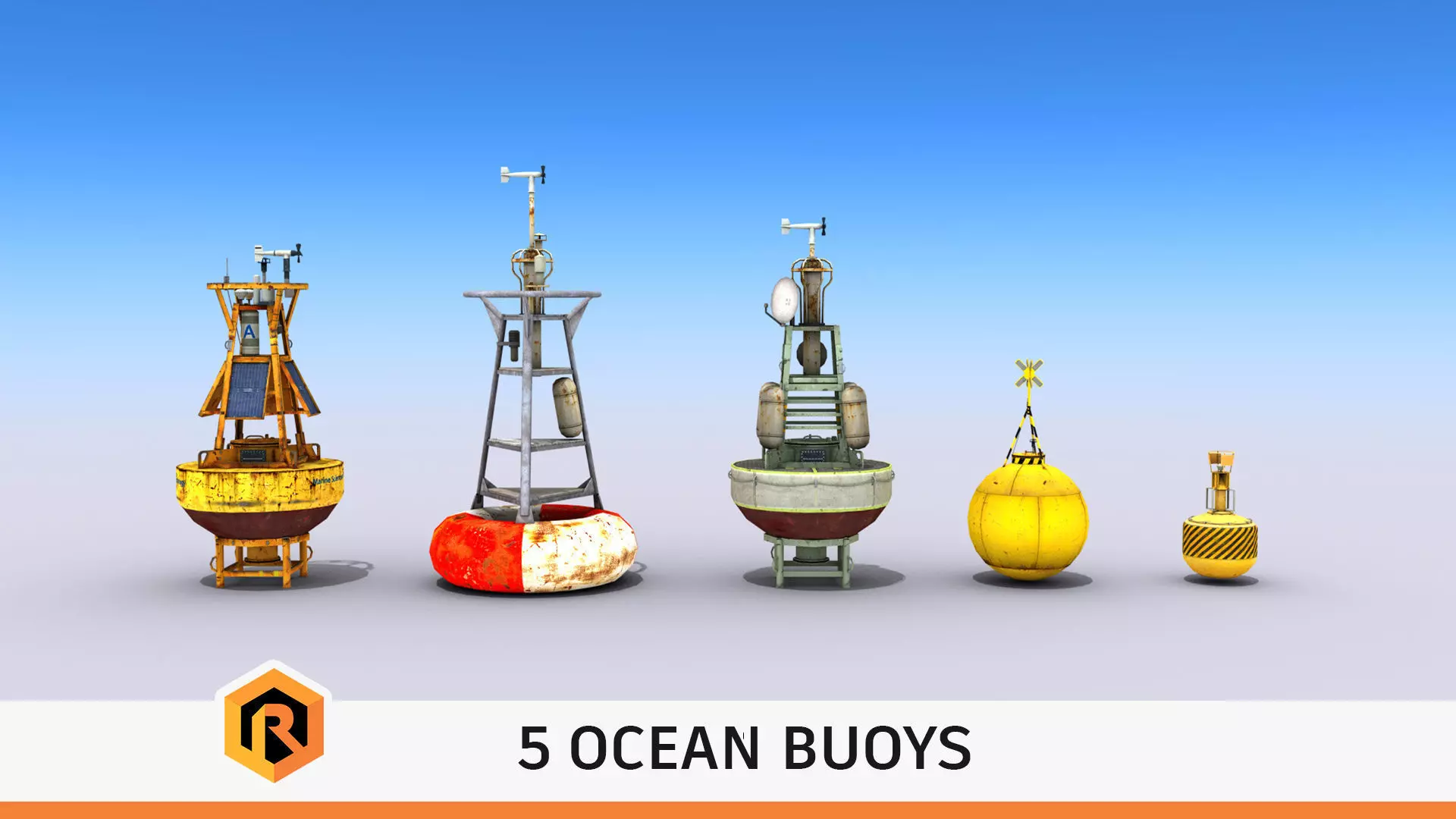 High-quality low-poly 3D model collection of 5 ocean buoys. There are some meteorological buoys and some common buoys.