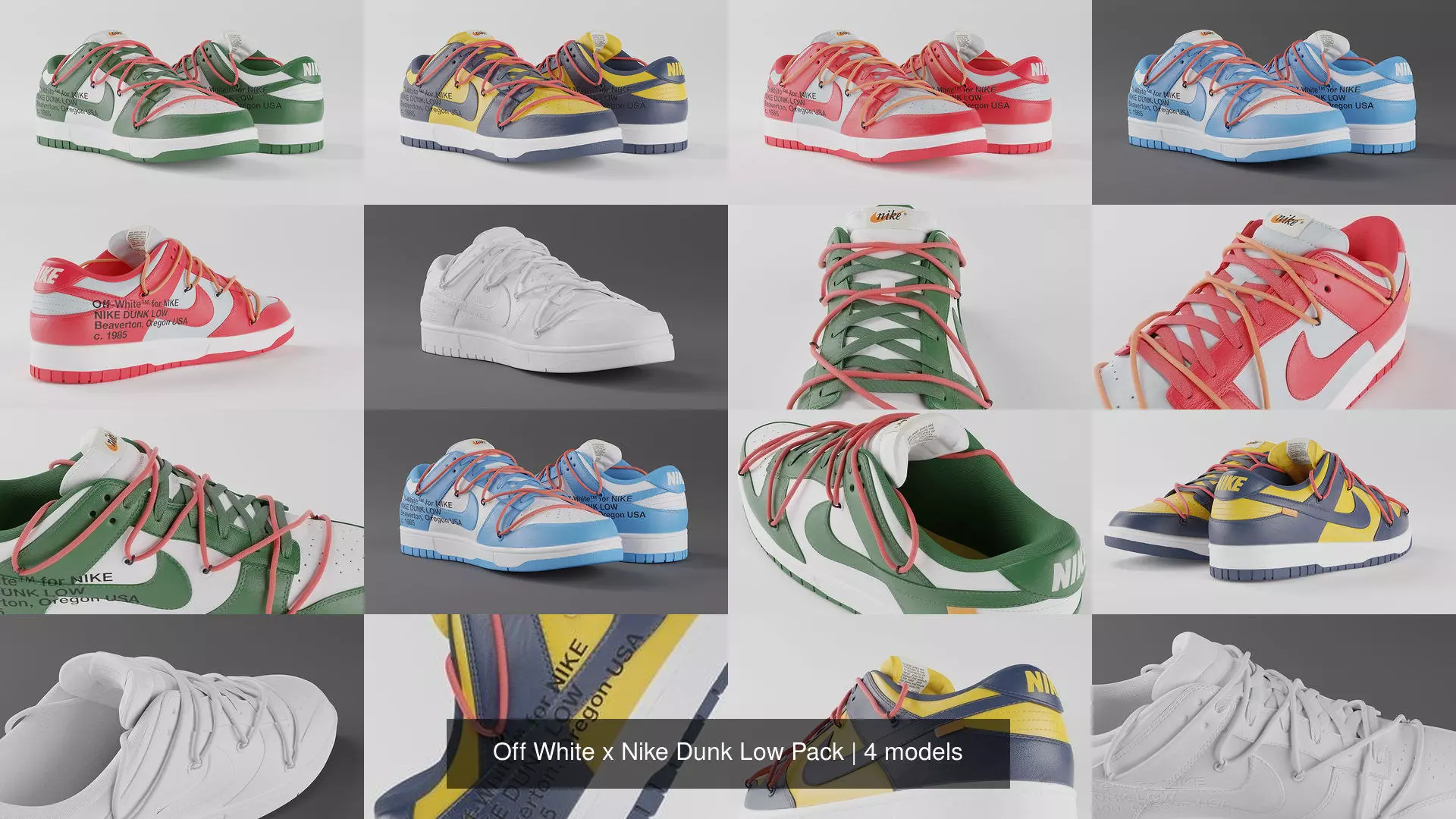 The four colourways of the Off White Nike Dunk Lows. More detailed descriptions for each shoe can be found in their respective pages.
