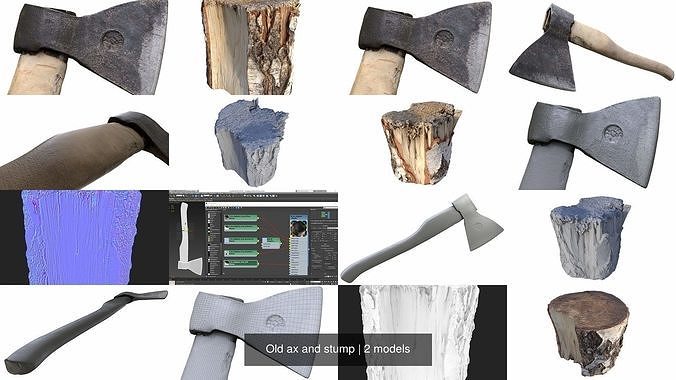 Old ax and stump for chopping wood.Models are made by photo scanning.Geo has been optimized and retopologized, textures have been retouched.