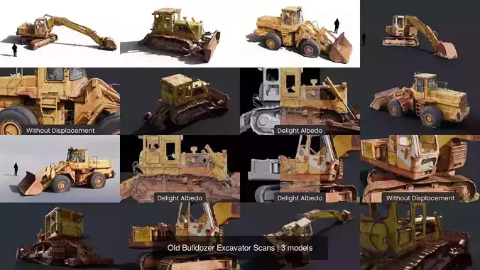 Collection of 3 detailed old construction machines. Bulldozer, excavator and wheel loader. Captured in neutral lighting conditions in Iceland, ensuring accurate surface detail and realistic color tones.