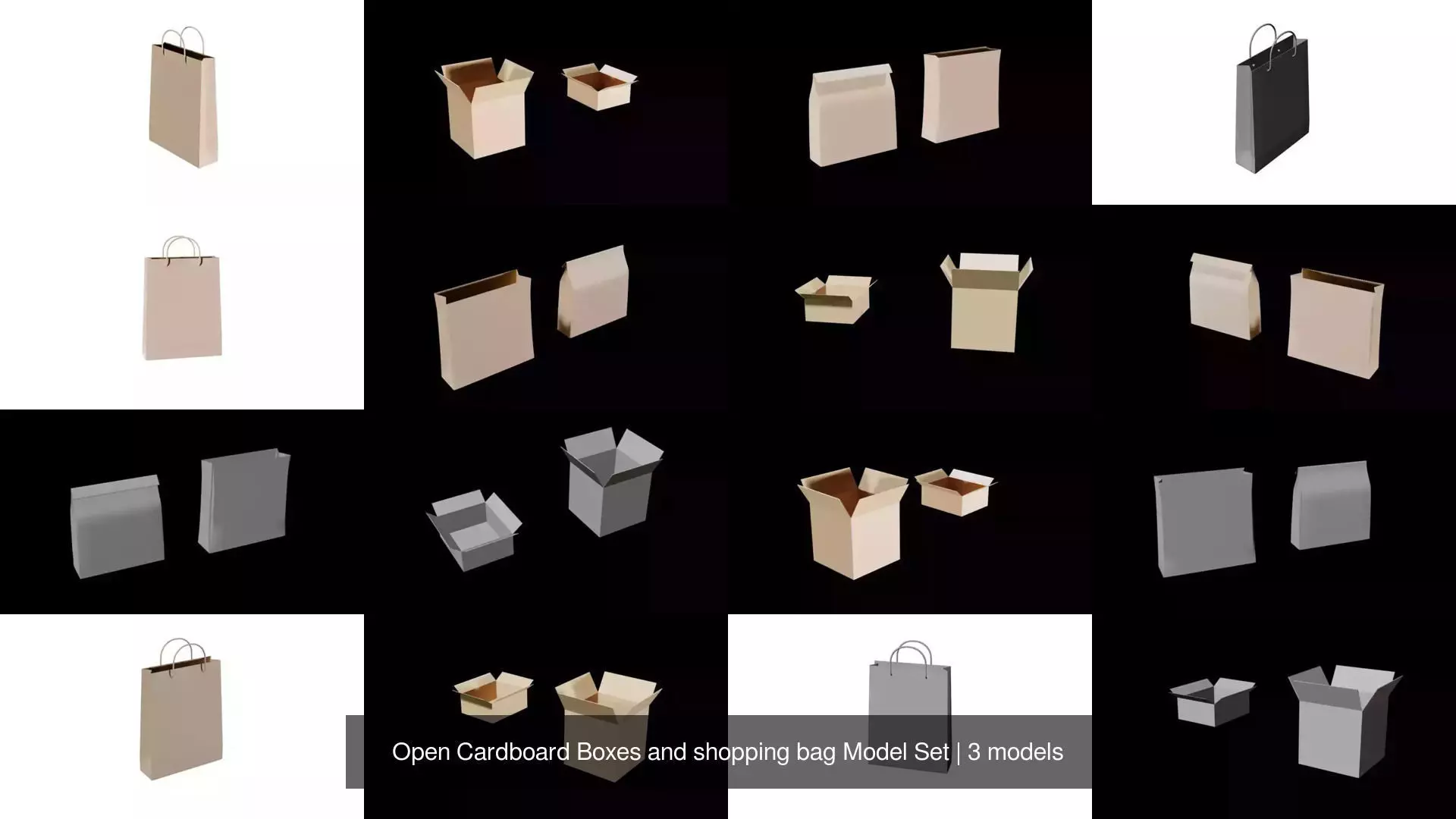 A versatile collection of realistic 3D open cardboard boxes and shopping bag, perfect for various visualization needs. This set includes multiple sizes, offering flexibility for packaging design, e-commerce product visualization, architectural renders, and game environments. Each model features clean topology and realism, making them ready for immediate use in your projects. Enhance your scenes with authentic industrial or storage elements.