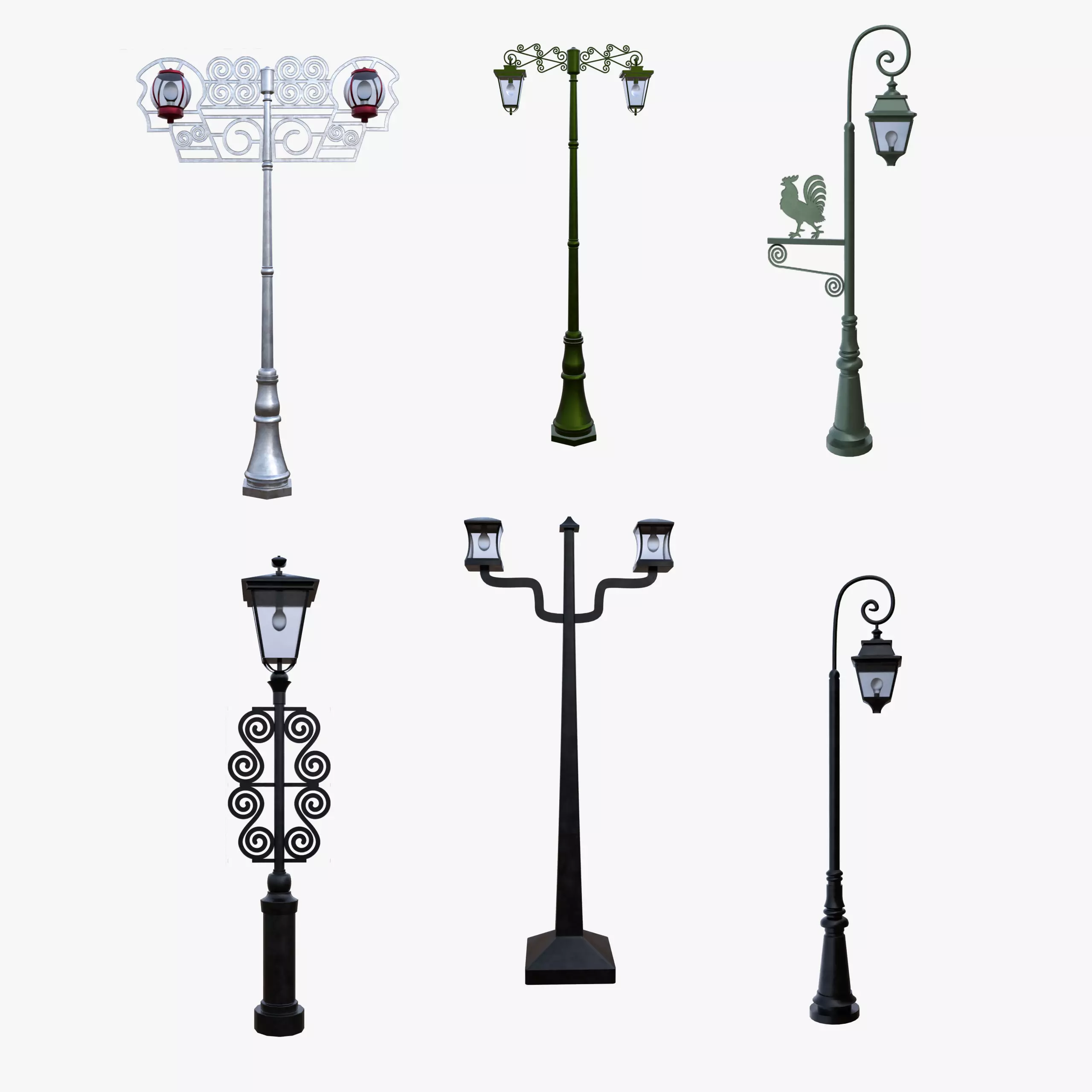 This high-quality collection includes six decorative vintage street lamp designs suitable for realistic, stylized, and historical environments. The models are optimized for both real-time engines and high-end rendering workflows.