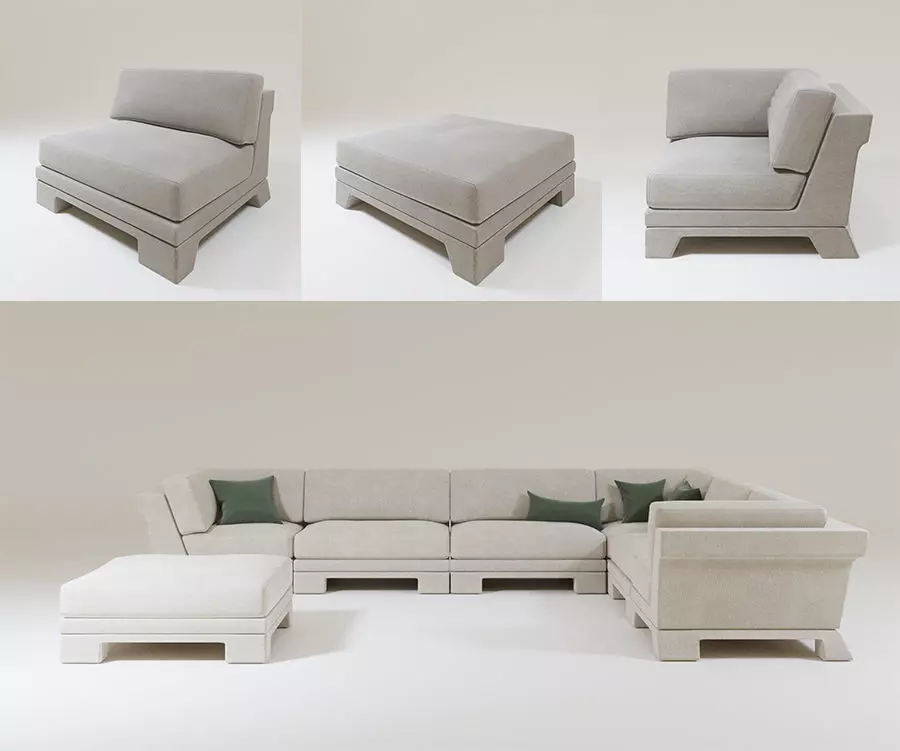 Total: 420cm x 315cm x 75cm 165.3x 124 x 29.5Corner: 105cm x 105cm x 105cm 31.3 x 41.3x 29.5Single Sofa: 85cm x 105cm x 75cm 33.5x 41.3 x 29.5Otomano: 87cm x 87cm x 40cm 34.2 x 34.2x 15.7Site description: The PATT line combines comfort with purity of design. Both elegant and imposing, the line is designed like a sculpture, each piece has been meticulously worked to be as refined from the front as from the back. Composed of a sofa, two half sofas, a slipper chair and a pouf, each element lives as well together as separately.