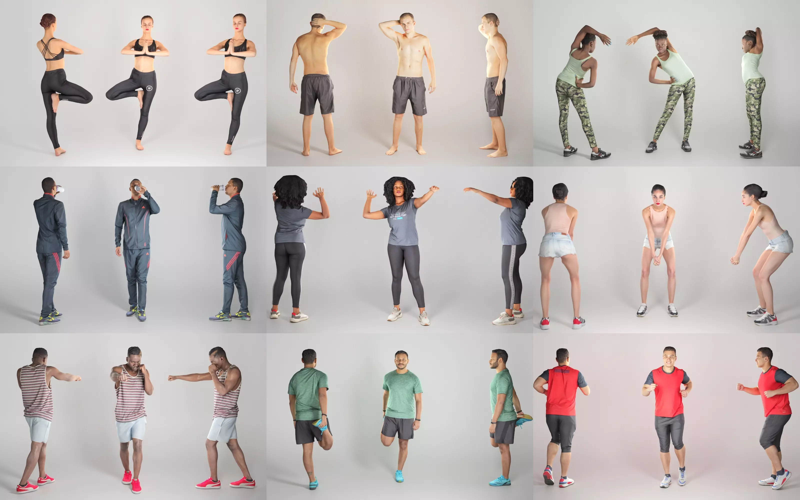 This is a collection of nine true human size and detailed models of handsome men and attractive women dressed in sports style. The models are captured in casual poses to be perfectly matching to variety of architectural visualization, background character, product visualization e.g. sport ground, beach, jogging track, gym, park, VR/AR content etc.