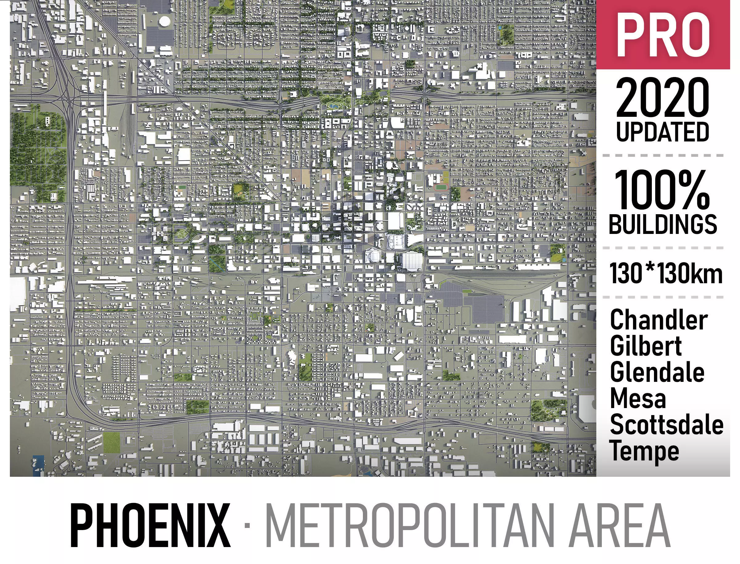 This is exact and accurate to scale 3D city model of Phoenix Metropolitan Area and its surrounding area based on GIS data (March 2020)