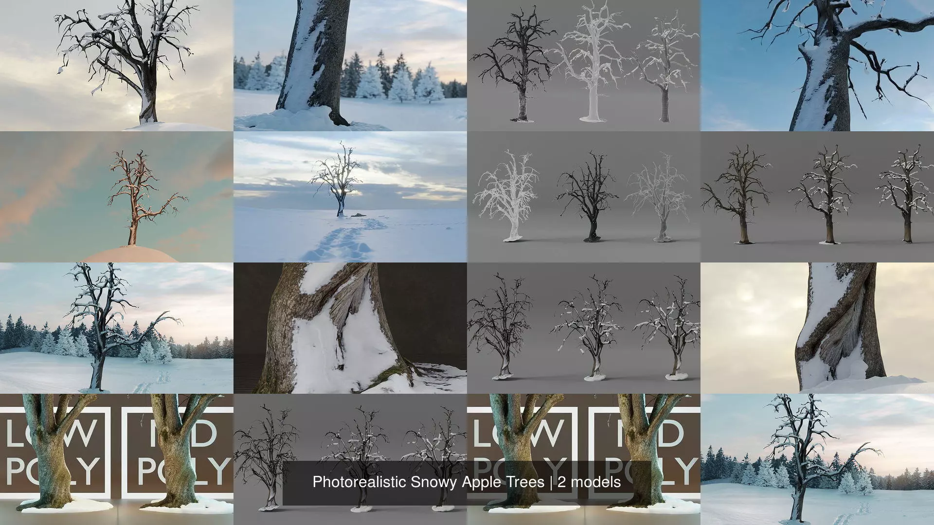 This collection includes photorealistic snow covered apple trees in low poly and mid poly and high poly version for your VFX, Games and 3D environments.The old apple tree is photographed under favourable weather & light conditions, accurate photo scanned with attention for detail. Both types of this pack (lowpoly and midpoly) are retopologized, clean and unwrapped. Ready for use them in a close-up shot or as a particle system.