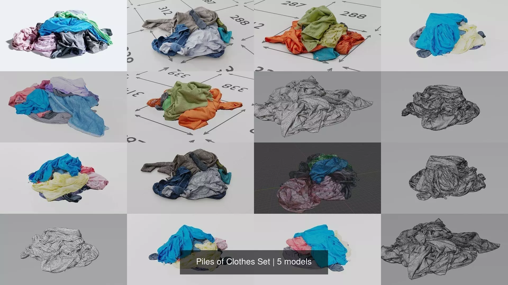 This set contains 3D scanned piles of clothes. All assets are available in multiple levels of detail, ready for photorealistic scenes to VR assets.