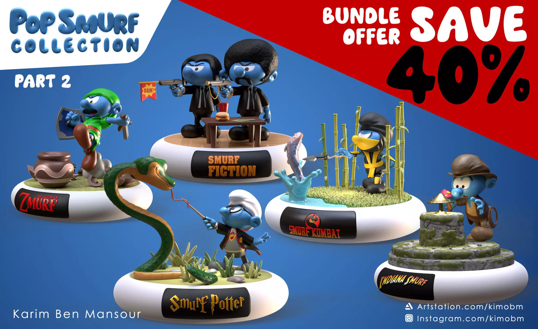 This second pack contains all of these models : 6 - The legend of Smurf, tribute to Zelda, 7 - Smurf Potter, tribute to Harry Potter, 8 - Smurf Fiction, tribute to Pulp Fiction, 9 - Indiana Smurf, tribute to Indiana Jones, 10 - Smurf Kombat, tribute to Scorpion from Mortal Kombat.