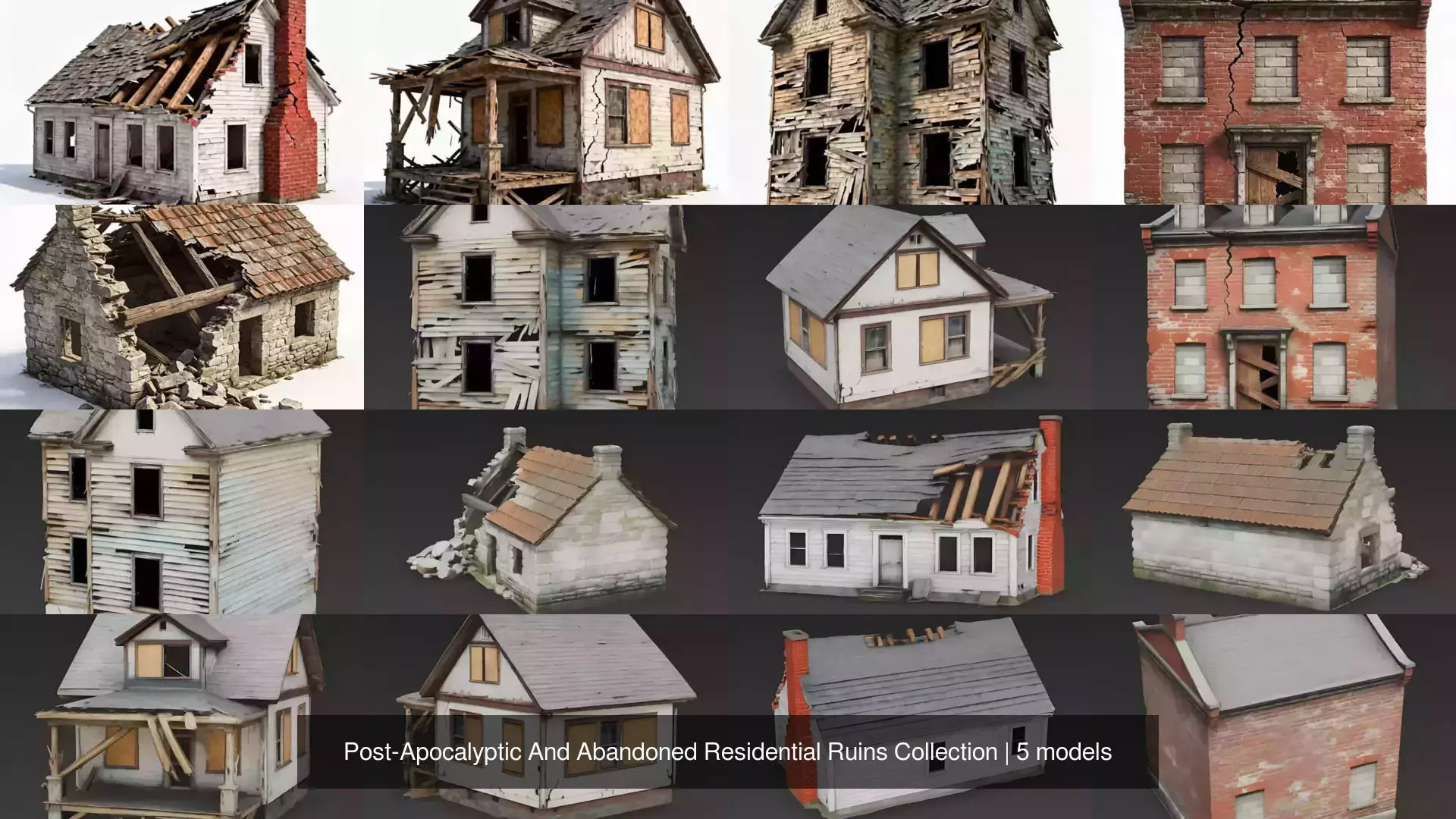 Collection DescriptionSet the scene for urban decay, desperate survival, and environmental storytelling with this highly authentic library of ruined residential architecture.This collection is the definitive toolkit for level designers and developers building survival horror games, post-apocalyptic open worlds, or realistic war-torn environments. The set captures the haunting beauty and tragic destruction of classic home styles: