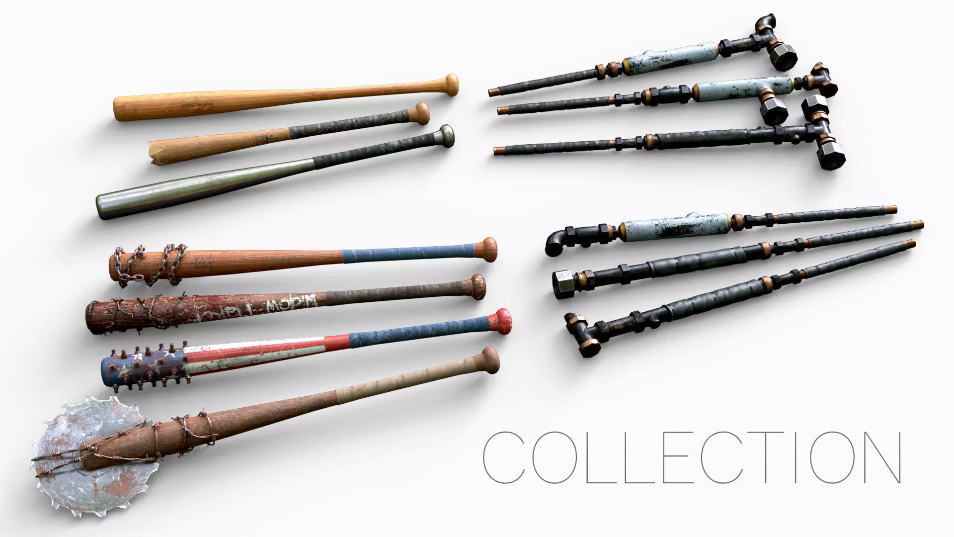 This collection is my post-apo melee weapons pack ready for games and including LODs and colliders. This pack includes 6 plumbing pipe prefabs & 7 baseball bats for 3 materials only (1 for pipes and 2 for baseball bats). The pack includes also 12 modular pipes elements to make your own plumbing pipes weapons.