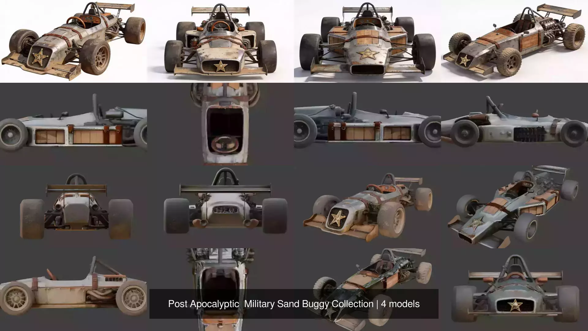 Description:This collection features a powerful set of rugged sand buggy vehicles designed for harsh environments, combining post-apocalyptic aesthetics with military and frontier-inspired designs. Each model is built with strong silhouettes, off-road capabilities, and detailed mechanical elements, making them ideal for action scenes, desert environments, and survival-themed projects.
