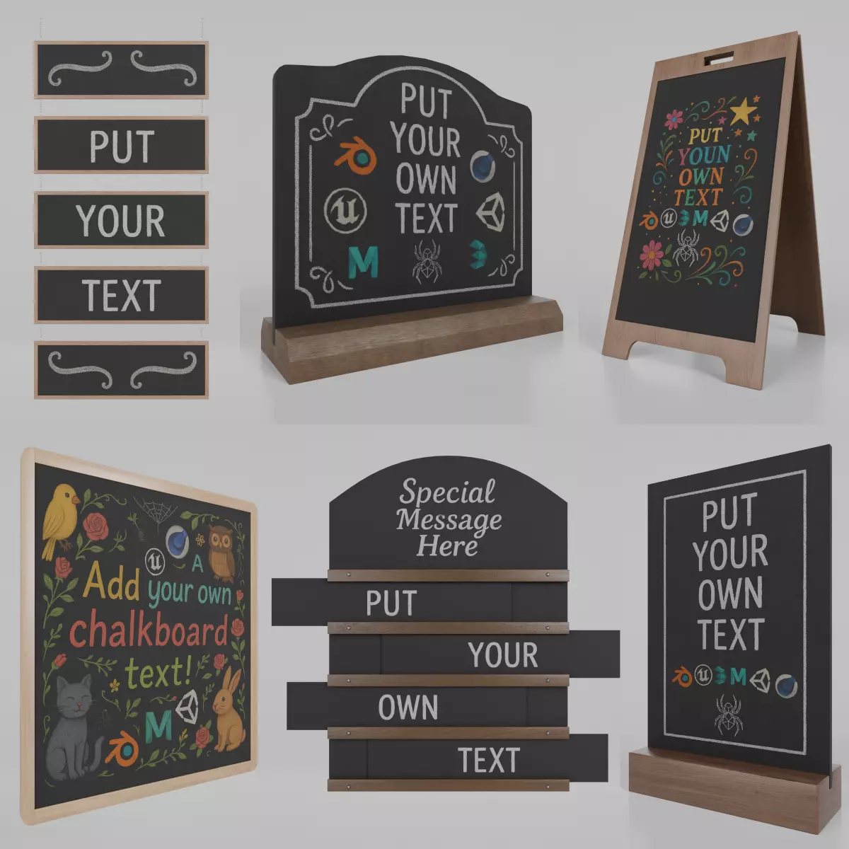 A professionally curated set of high-quality 3D chalkboard assets, combining six customizable sidewalk signs, countertop displays, and wall-mounted boards. Designed for architects, game developers, and 3D artists creating realistic commercial, educational, or hospitality environments.
