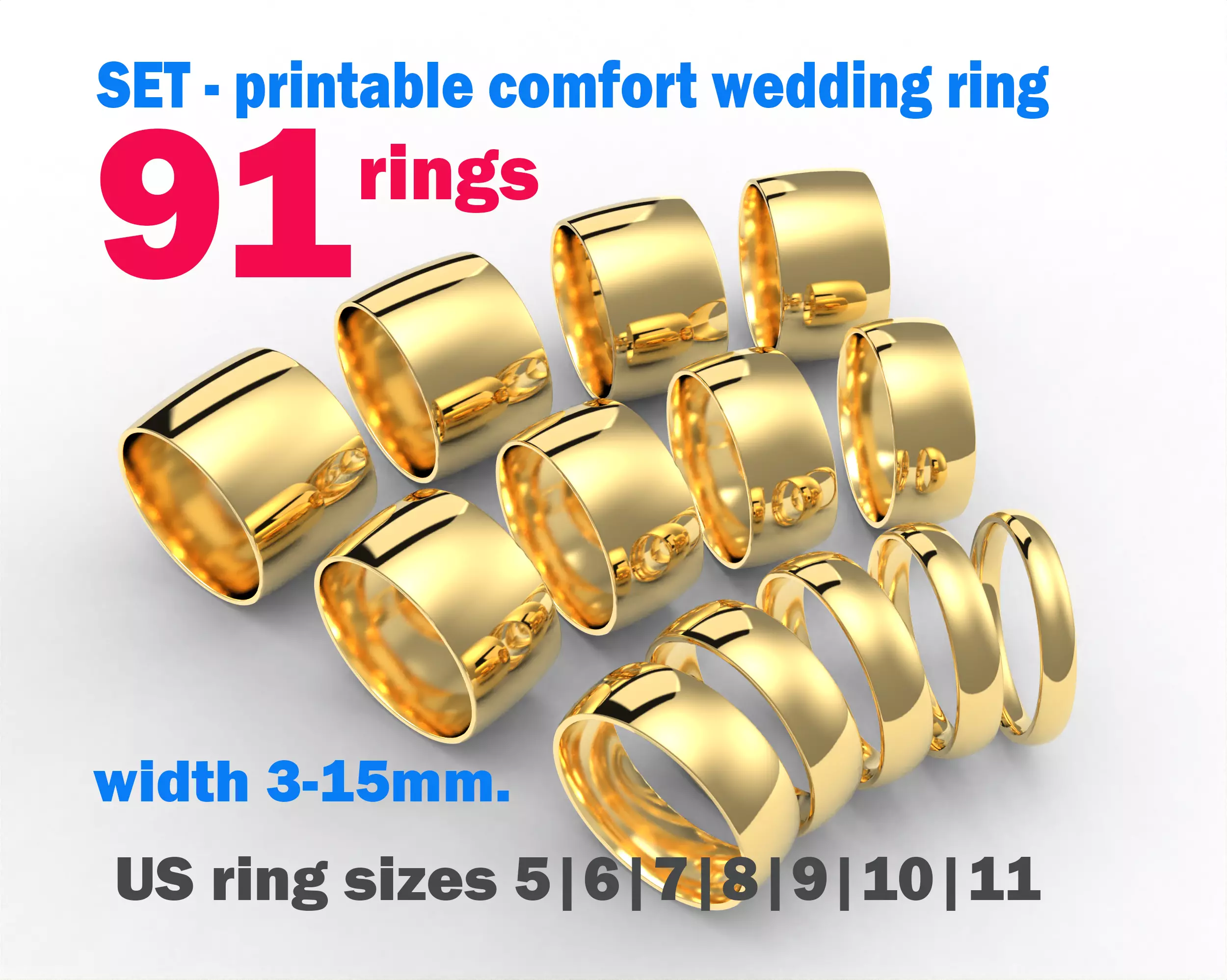 Printable jewelry comfort WEDDING ring STLWidth -3/4/5/6/7/8/9/10/11/12/13/14/15mm