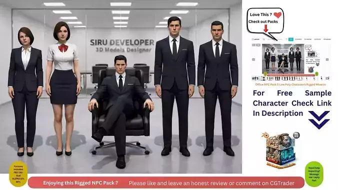 Female Office NPC Pack 5 Low Poly Characters Rigged Mixamo link :https://www.cgtrader.com/3d-model-packs/5-female-office-npc-characters-pack-rigged-game-ready-low-poly
