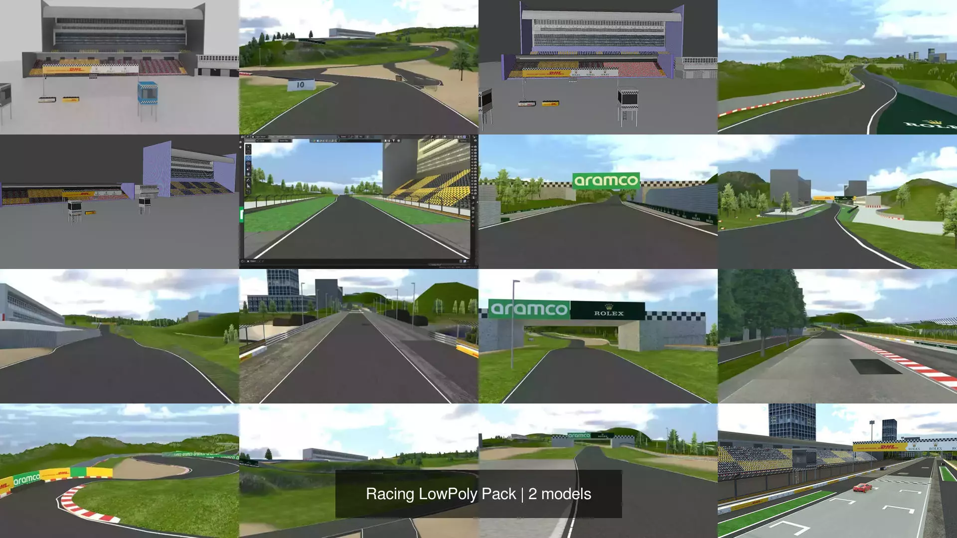 Racing LowPoly Pack combines low poly racing assets and racing track environment created using those assets.