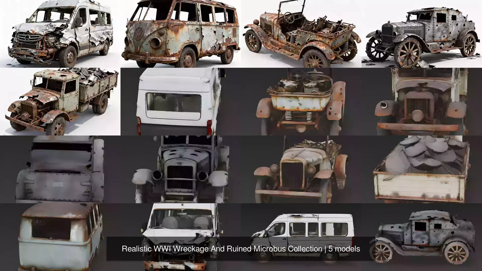 Collection DescriptionSet the scene for historical battlefields, abandoned highways, and intense environmental storytelling with this highly authentic library of wrecked civilian vans and early 20th-century military debris.This collection is the definitive toolkit for level designers and developers building realistic tactical shooters, historical documentaries, or immersive post-apocalyptic environments. The set captures the tragic aftermath of both heavy historical warfare and catastrophic roadside disasters: