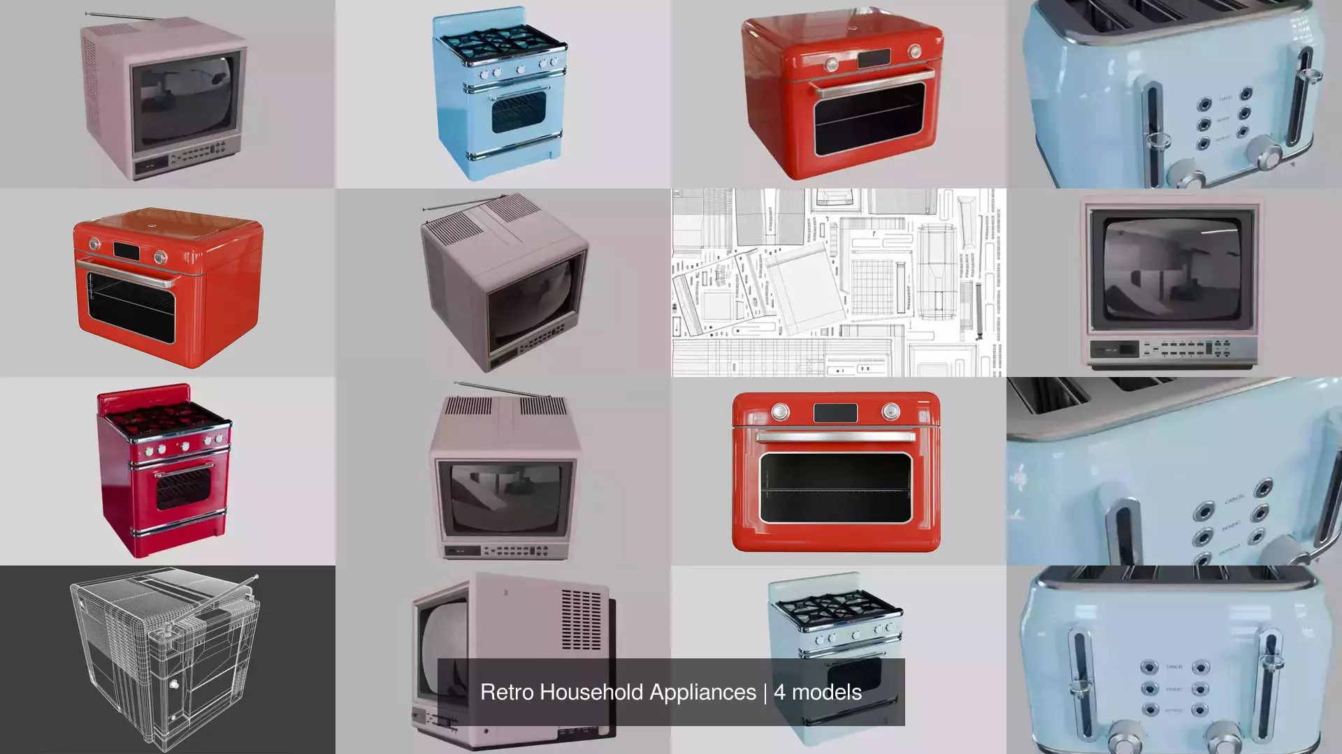 This pack includes a retro TV, oven, steam oven and a toaster.