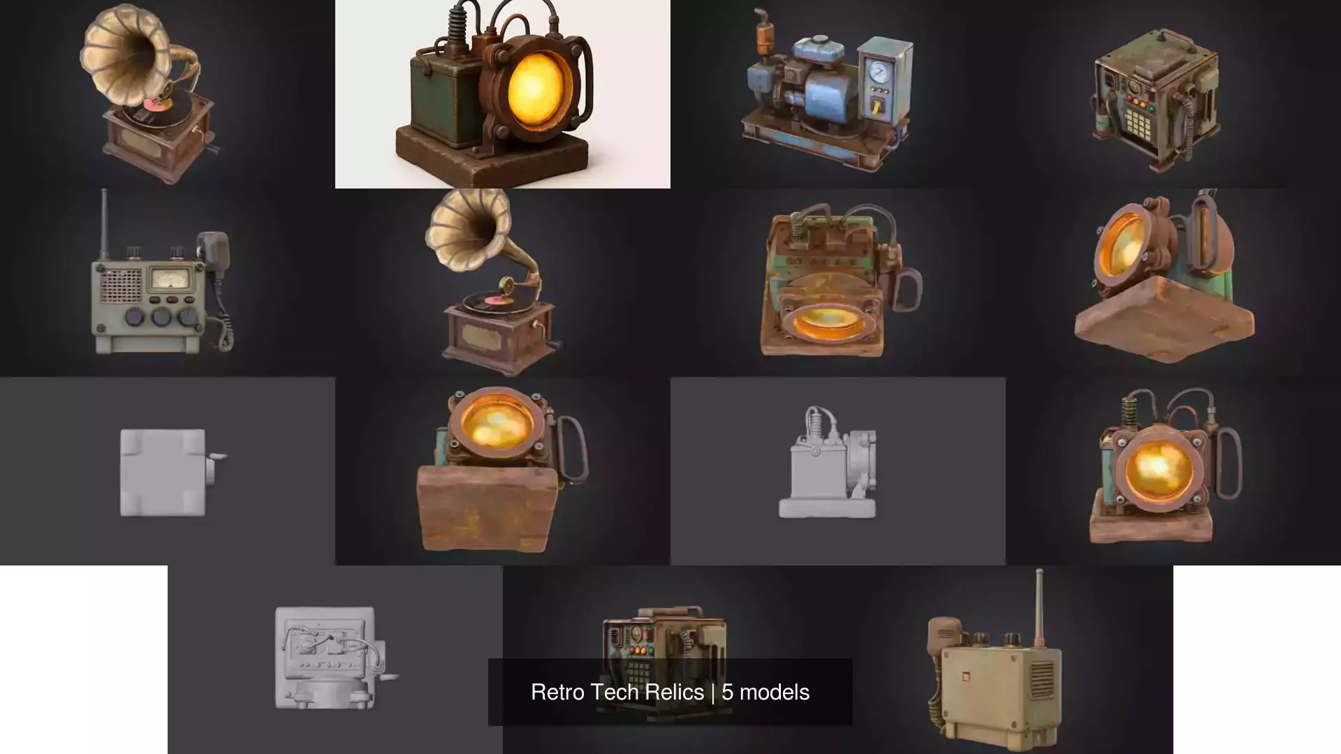 The Retro Tech Relics collection features an exceptional assortment of vintage-inspired 3D industrial devices that merge history, nostalgia, and mechanical craftsmanship. This set includes highly detailed models such as the Old School Radio, Rustic Generator, Retro Power Terminal, Steampunk Radiance Lamp, and Antique Gramophone — each designed to evoke the golden age of analog engineering.