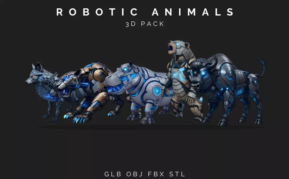 This high-poly 3D pack features five futuristic robotic animals, each carefully designed with advanced mechanical structures and highly realistic material definition. Every model combines powerful animal anatomy with layered metallic armor plating, exposed internal mechanisms, precision-engineered joints, and illuminated energy cores that enhance the overall sci-fi presence.