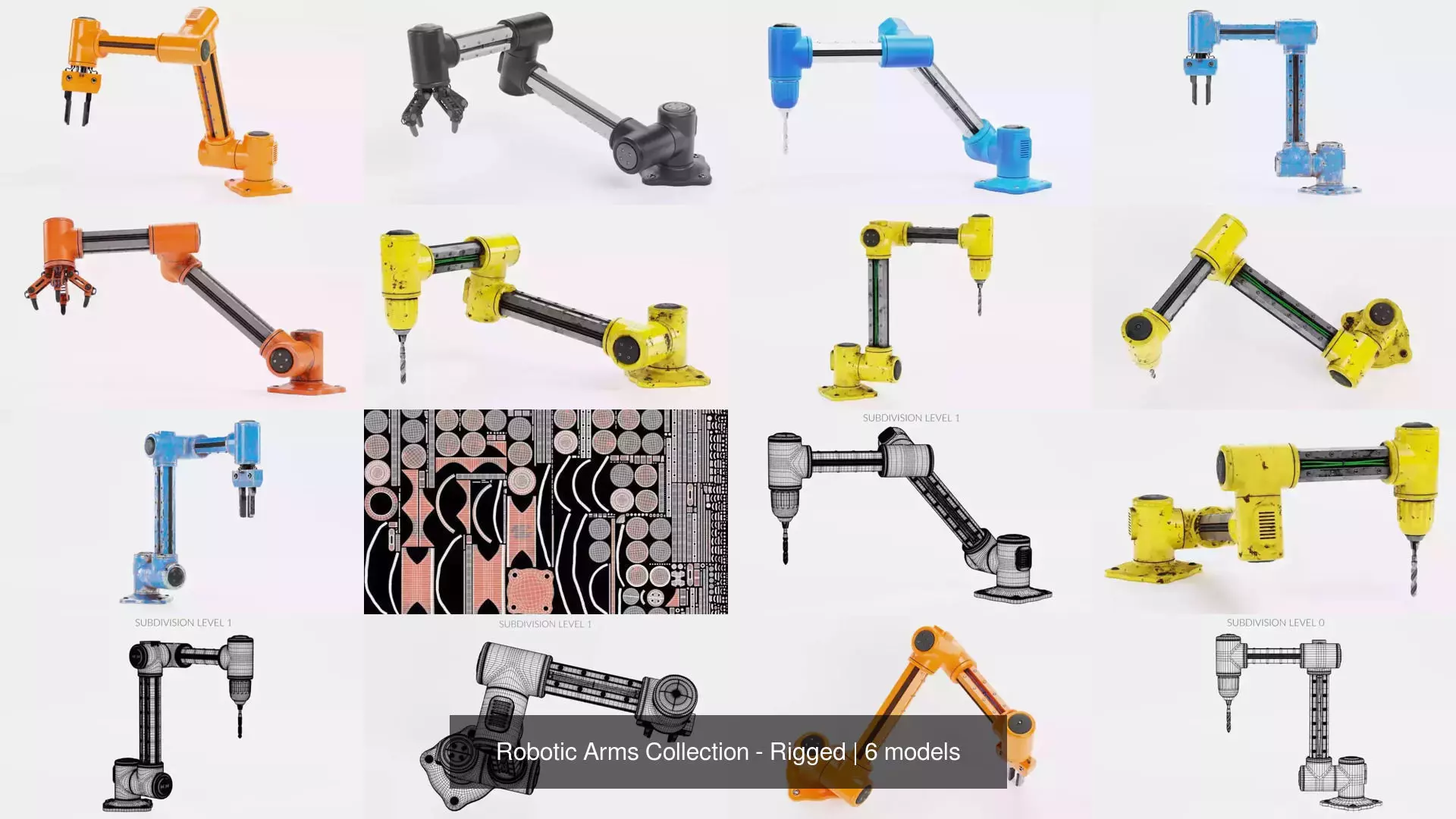 Set of six brand-neutral robotic arms, equipped with a three different end effector: a two-finger gripper, a four-finger gripper, and a drill attachment. All models share a unified mechanical structure, consistent industrial design, and fully rigged Blender armatures with constraint-based controls. The collection provides a clean, non-worn material treatment, and also used, worn industrial finish version, offering a precise representation of articulated robotic systems suitable for technical visualizations, simulations, and industrial scenes.