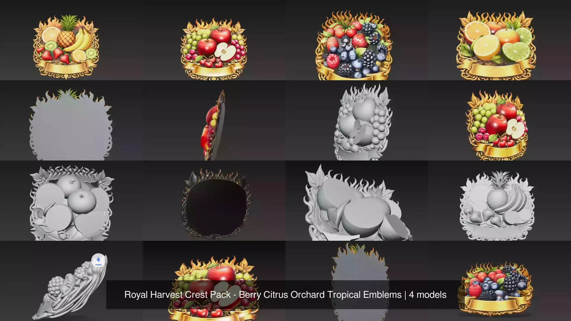 This collection celebrates different harvest themes, combining berries, citrus fruits, orchard harvests, and tropical fruits into a vibrant decorative crest series suitable for both rendering and high-quality 3D printing.