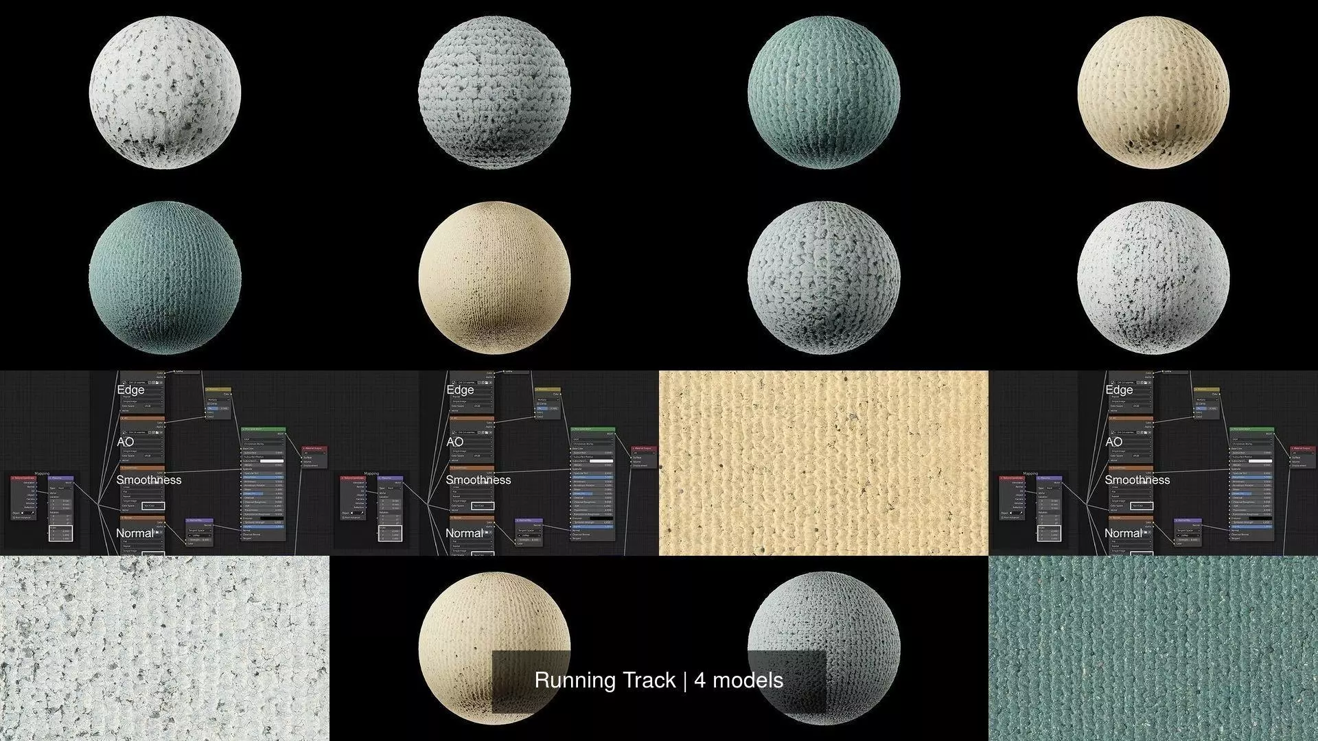 Running Track materials created with Materialize. Original image captured with a Canon 5D Mk III full frame DSLR with 85mm prime lens for maximum sharpness. Includes seamless and seamed versions of all maps in case you have a more elegant tiling method. Includes diffuse, smoothness, normal, ambient occlusion, and height/displacement maps. See node setup preview image for Blender Cycles node setup or refer to the included .blend file.