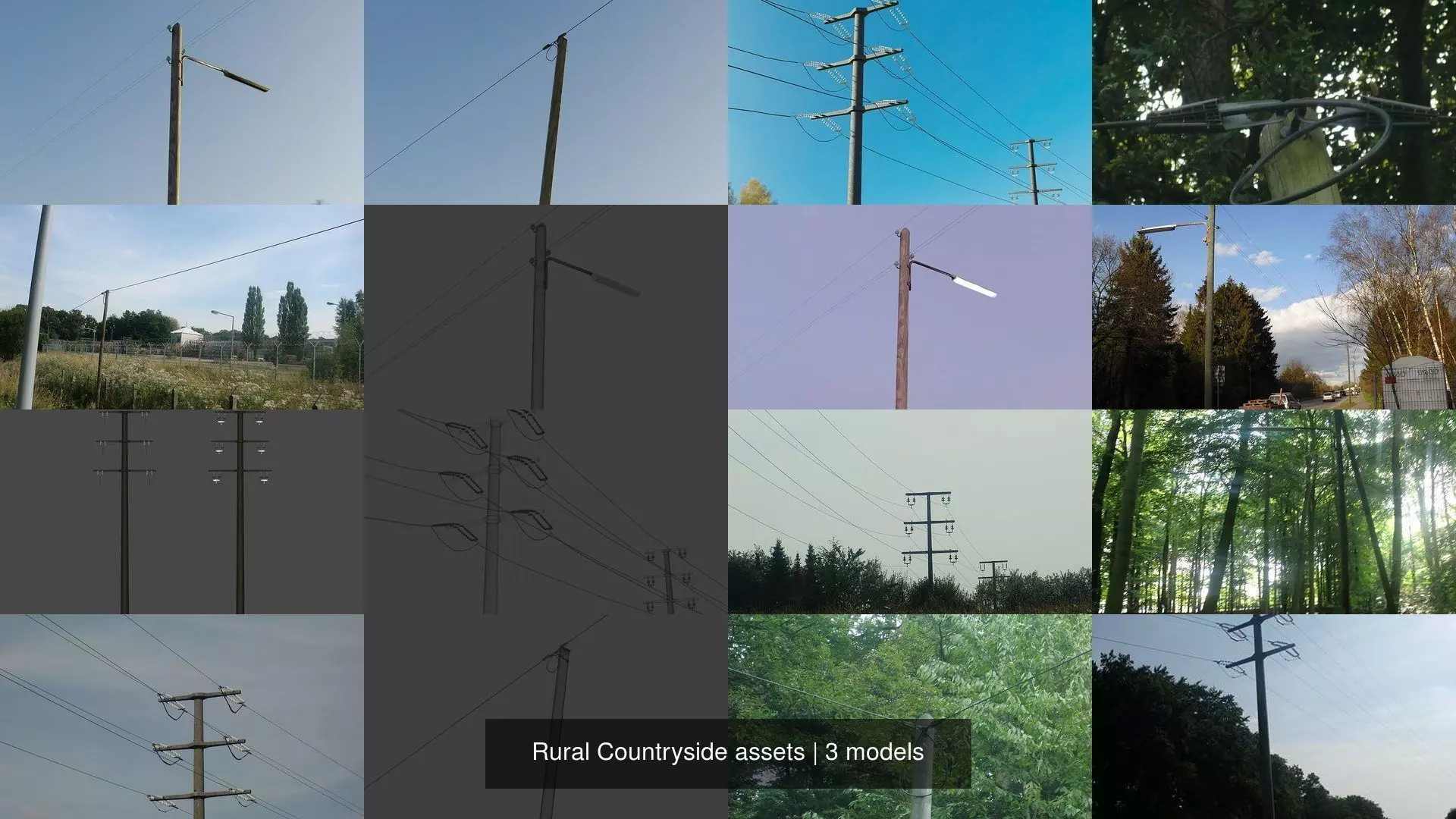 This collection includes rural/countryside assets like road lanterns, cable posts/pylons and more.These assets can be used for CGI/VFX and (theoretically) for games.