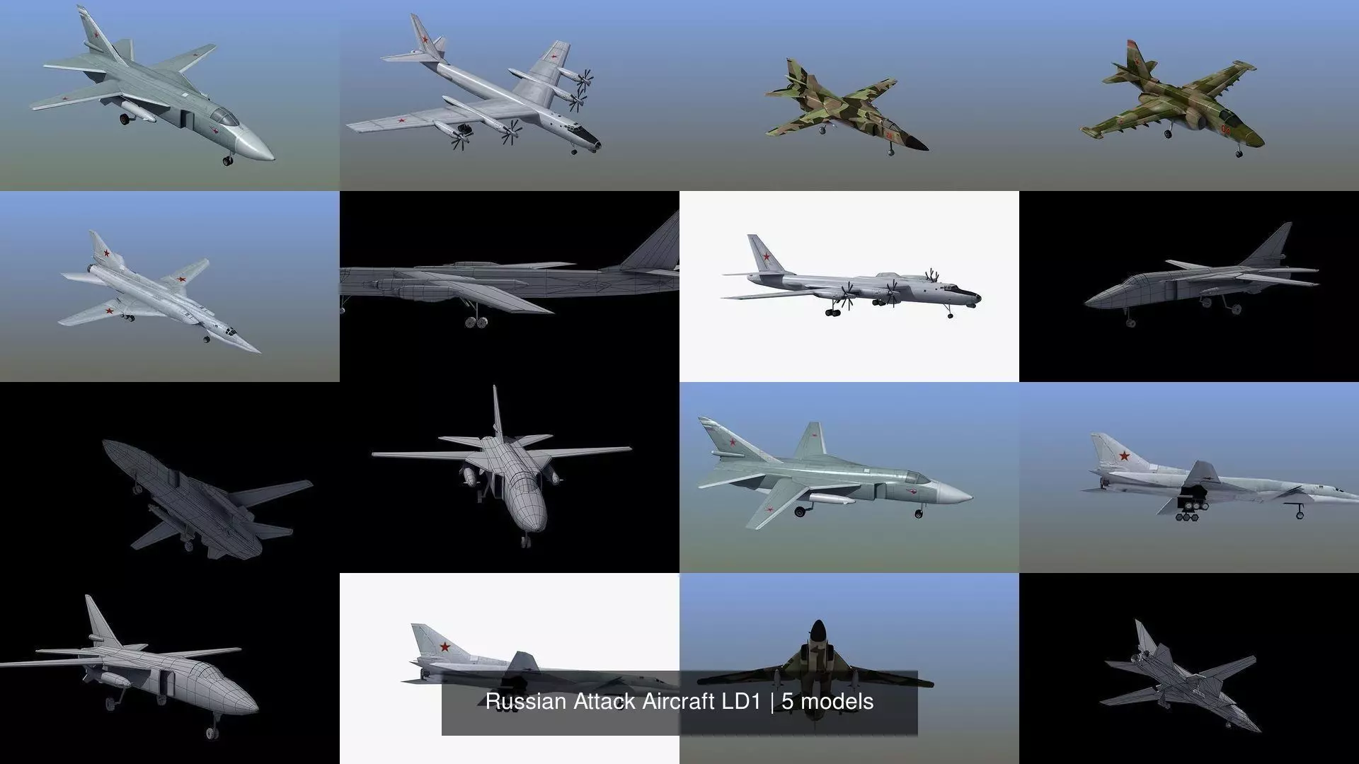 Collection of low poly Russian attack aircraft and bombers. Great multipurpose 3D models - ideal for offline rendering or real time uses such as games or simulation. Landing gea included.