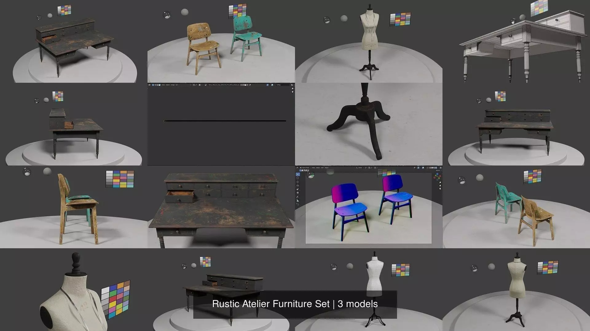 This Rustic Atelier Furniture set includes a chair (with two materials), a table with ten drawers (with one material), and a mannequin with measuring tape.