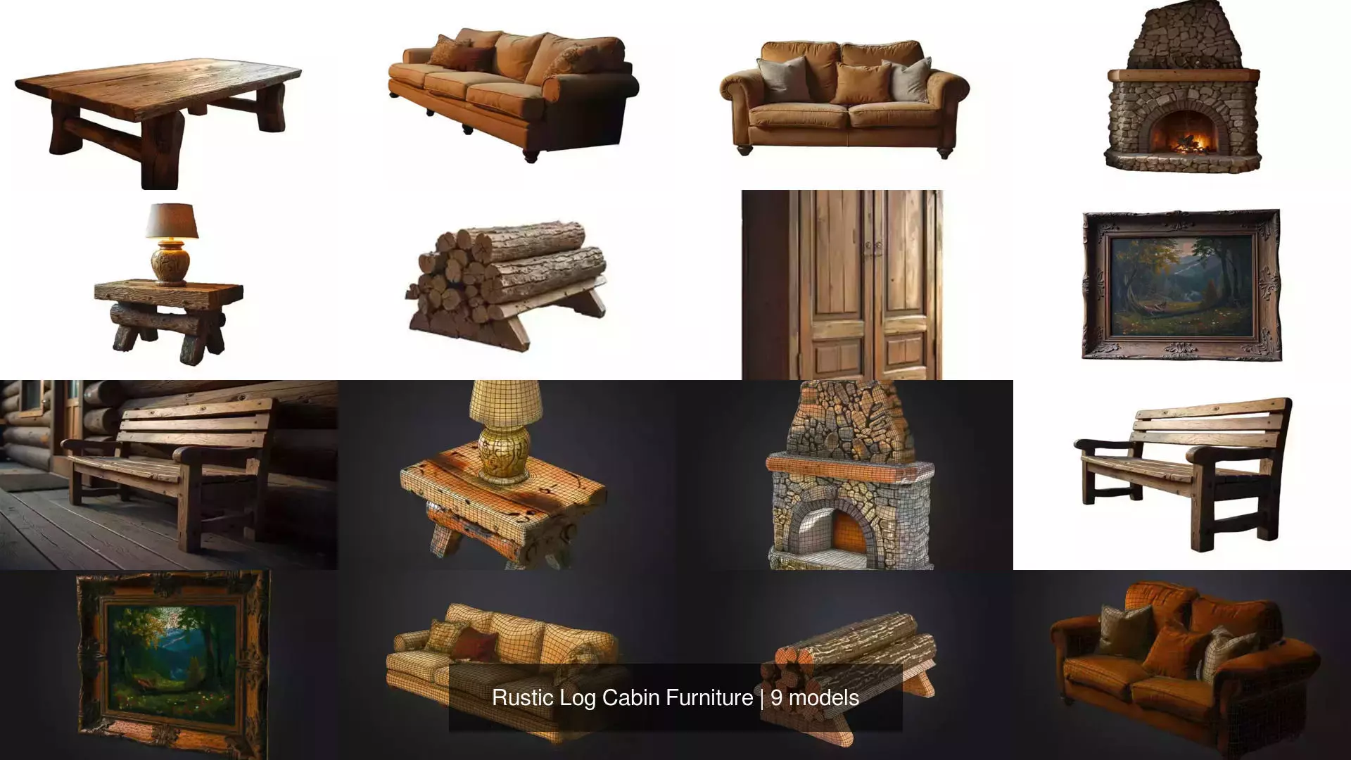 Rustic, hand‑crafted wooden furniture set featuring a couch, loveseat, coffee table, armoire, fireplace, painting, and end table with lamp. Perfect for cozy interiors, cabin scenes, and warm, natural environments.
