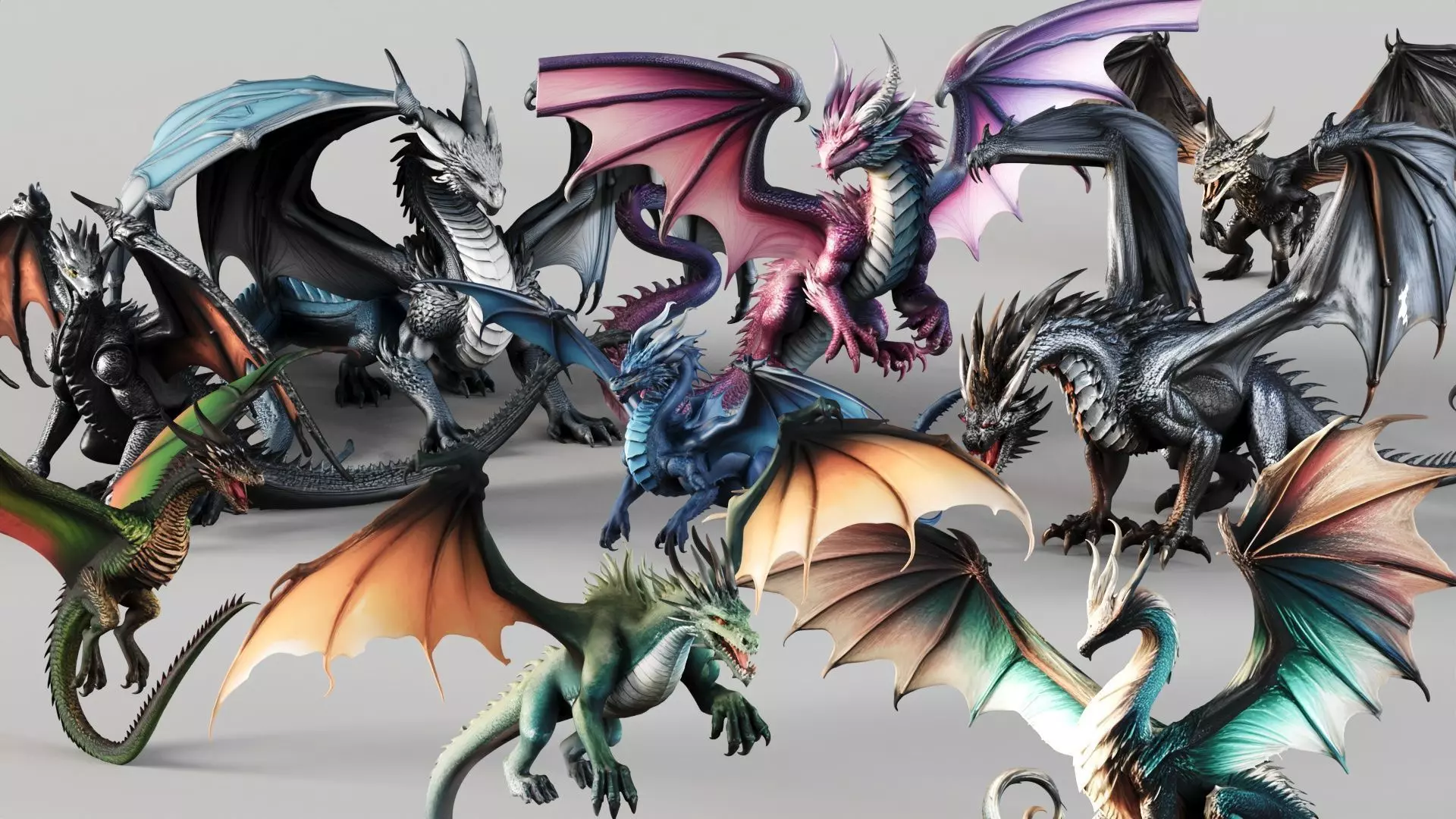 A premium collection of 9 highly detailed dragon 3D models designed for professional use in games, cinematics, and collectible projects.