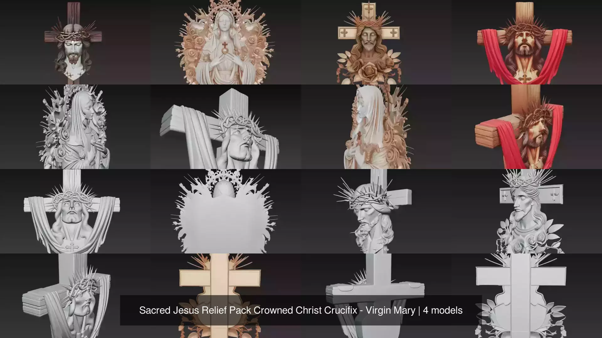 Sacred Christian Relief Pack is a carefully curated collection of four high-detail religious wall sculptures featuring crowned Christ crucifix reliefs and a sacred heart Virgin Mary composition. This pack brings together powerful Christian symbolism, emotional expression, and classical sacred art aesthetics in a unified sculptural series.