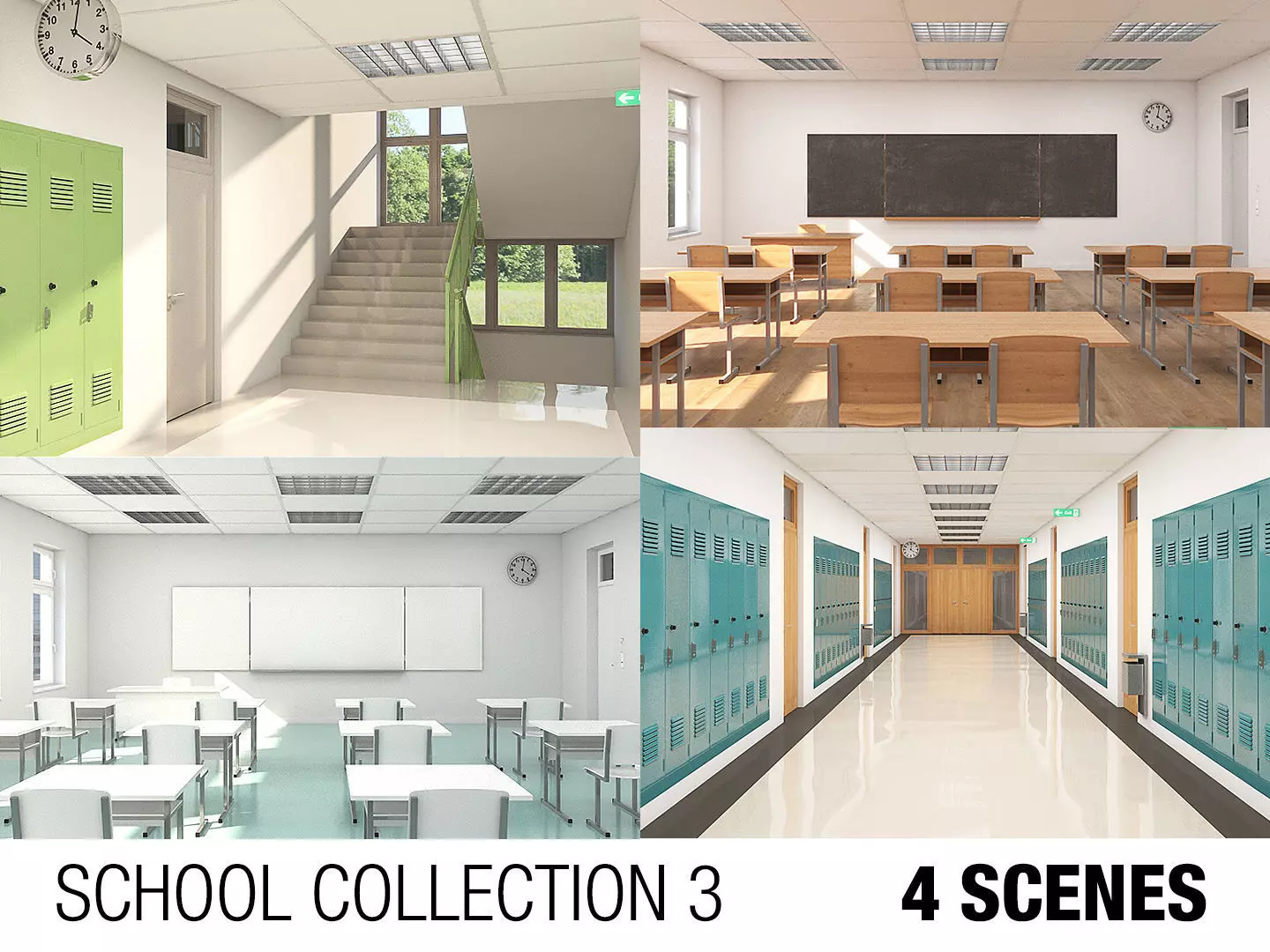 A COLLECTION OF FOUR INDIVIDUAL SCHOOL SCENES - CLASSROOM INTERIOR x 2, HALLWAY x 2: