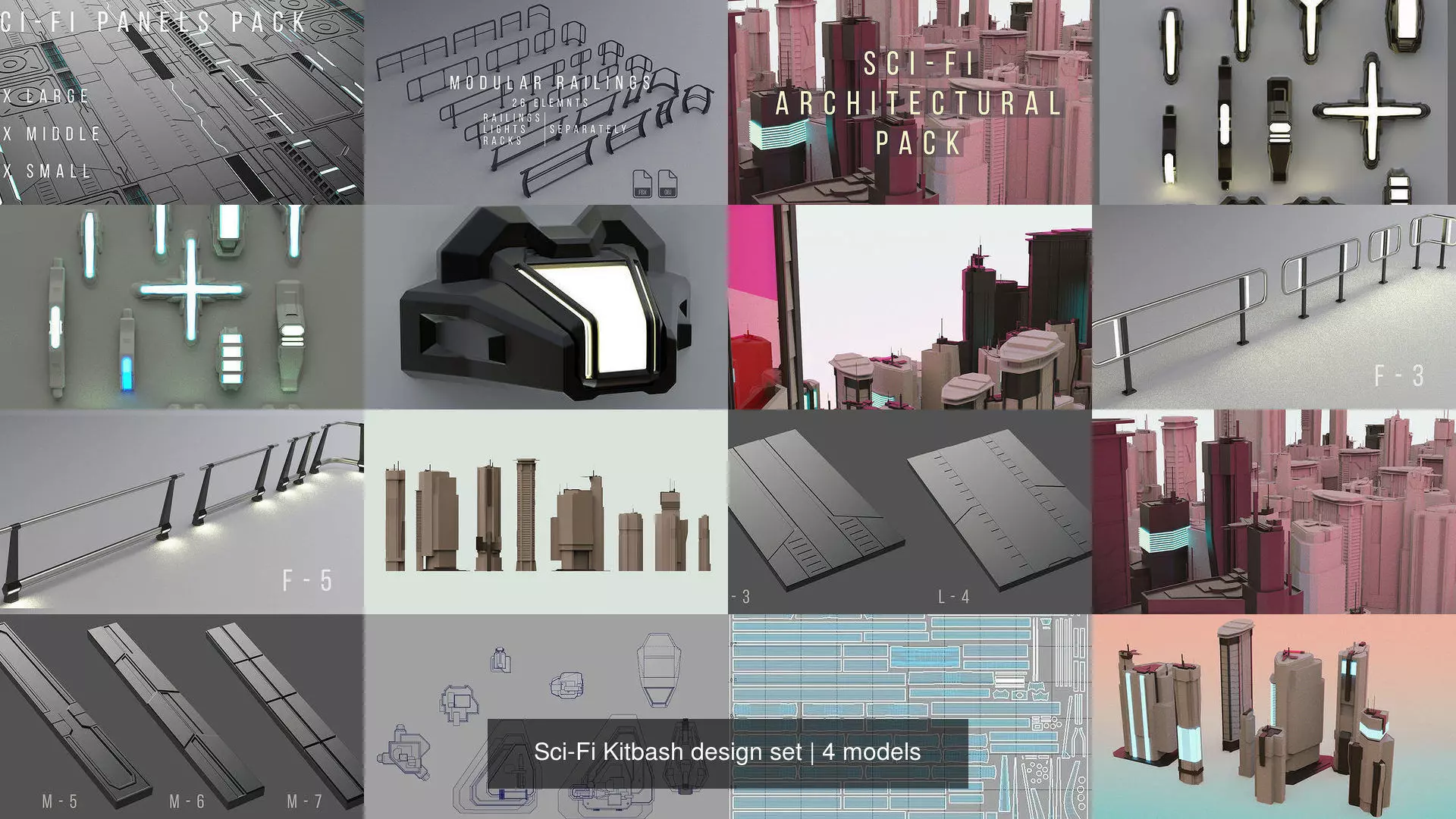 20 modular sci-fi panels All panels are SubDiv ready Panels L-6,M-3, S-1, S-2, S-3, S-4, S-5, S-6, S-7 have separated parts as Light and lattice