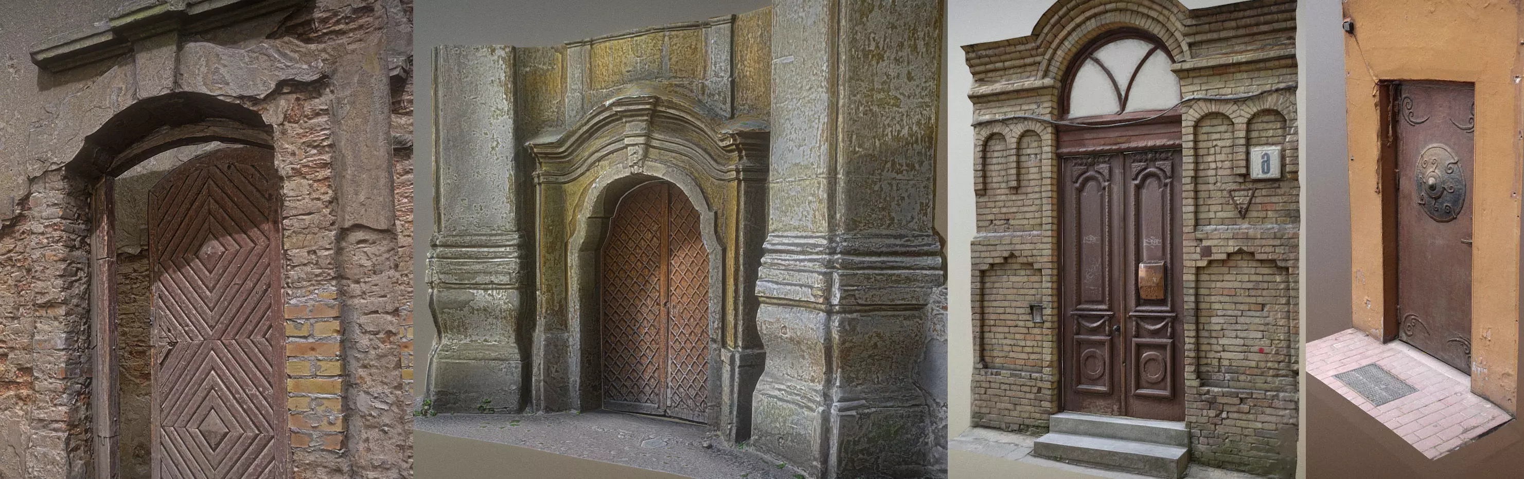 Scanned photorealistic old metal door - mongolian style Low-poly 3D modelDoor of VIlnius. This an actual door in Basanavičiaus street, Vilnius. This used to be (or still is) a restaurant by a name Čingishanas (Genghis Khan), so I guess it suppose to be Mongolian style. Suitable for any real time graphics - games, Augmented reality (AR) or virtual reality (VR). The wall is with open wires and cracks in plaster. Metal shield is depicted on a door. Good for run down cities. Textures are at 4k. Diffuse (color), Bump and normal map is included. (Only one side)Scanned photorealistic old ornamented door Low-poly 3D modelLow poly prop for VR / AR or flat screen game and any type of interactive application. Old wooden door in a brick house with dangling cable and a window above doors. Photogrammetry model with 4k textures that include diffuse, normal, bump and opacity maps. Manual retopology from scanned model. (Only one side) Old rusty church gate scan Low-poly 3D modelOld entrance gate to an old church. Photo-realistic 3D scanned model comes with 4k PBR textures and 3 LOD versions. Slow and a very fast door opening is animated in 3d max scene as well as in .fbx format. Door opens inwards much better. Other direction causes some intersections with a wall. Gate is decorated with symmetrical pattern made of wooden planks. Pictures of a gate where taken in a sunny day so light direction is baked in color map, but Photoshop was used to mitigate light directionality. Parts of gate that where barely seen from ground has less accurate textures. Manual retopology was performed on LOD 0, and automatic decimation was used for LOD 1 and 2. Level of detail as indicated by 3d s Max: lod 0 - 1939 polys, 3419 tris, 1812 verts. lod 1 - 1175p,t., 649v. lod 2 - 329p,t., 191v. The church was build in 1746–1768 in late baroque style. It was build as a Catholic church but in 1859 converted to Orthodox worship place then converted back to Catholic one. After second world war the church converted to a vegetable warehouse and two Concrete ceilings where constructed inside a Church. Now it is used for exhibitions and for Catholic ceremonies as well. Note that this is one sided thinn (no thickness) geometry. so if you plan for a camera to go in you will need to model the interior, and some thickness for door / gate. Old broken gate - door with relief decoration Low-poly 3D modelSmall entrance to a yard of residence building and a chapel. Broken bas-relief decorations surround the top of the gate. Some plaster still remains and some is no longer there so the bricks are exposed. Most of bricks are broken - some are newer, some are much older. The door is made out of small rustic wooden planks forming a nice diamond shaped pattern. Wooden parts are somewhat rotted and decayed. Model was scanned using photogrammetry therefore nice realistic textures are captured. PBR textures comes at 4k resolution. also includes bump map. LOD 0 has manual retopo at 5856 p. 3069 v. LOD 1 1436 p. 775 v. LOD 2 -370p. 215v. (as reported in 3d S max ) only fbx models are animated fast and slow dor opening. Note that this is one sided thinn (no thickness) geometry. so if you plan for a camera to go in you will need to model the interior, and some thickness for door / gate.