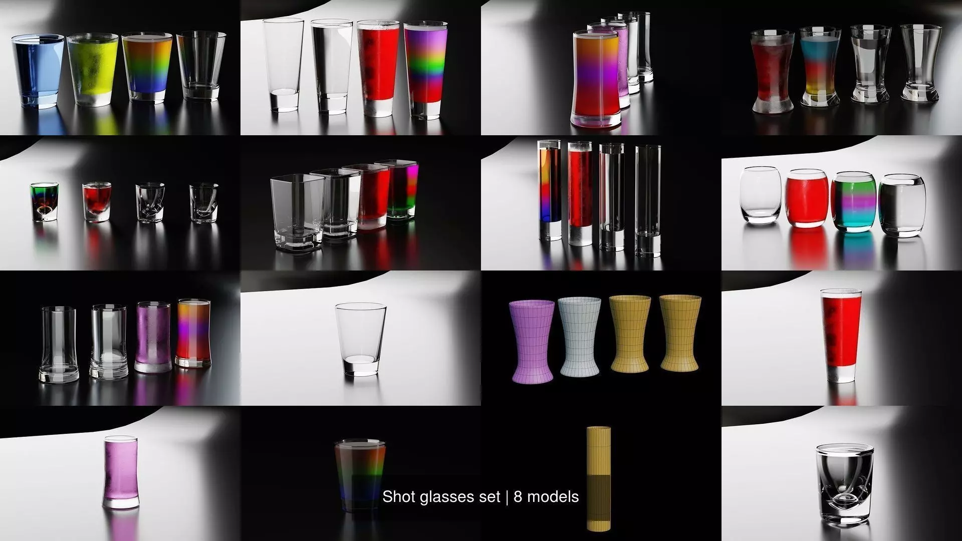 This is a high-quality 3D models of shot glasses.For each type of glass I added few templates like: