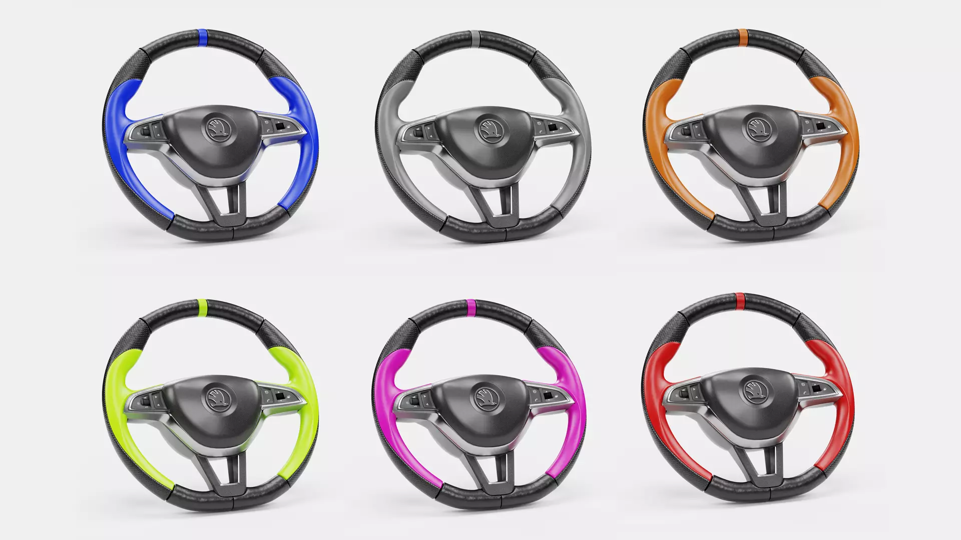 There are six color steering wheel. These are high detailed full 3d steering wheel models. Models are fully designed in Substance Painter and incorporated into the model in the form of PBR textures.