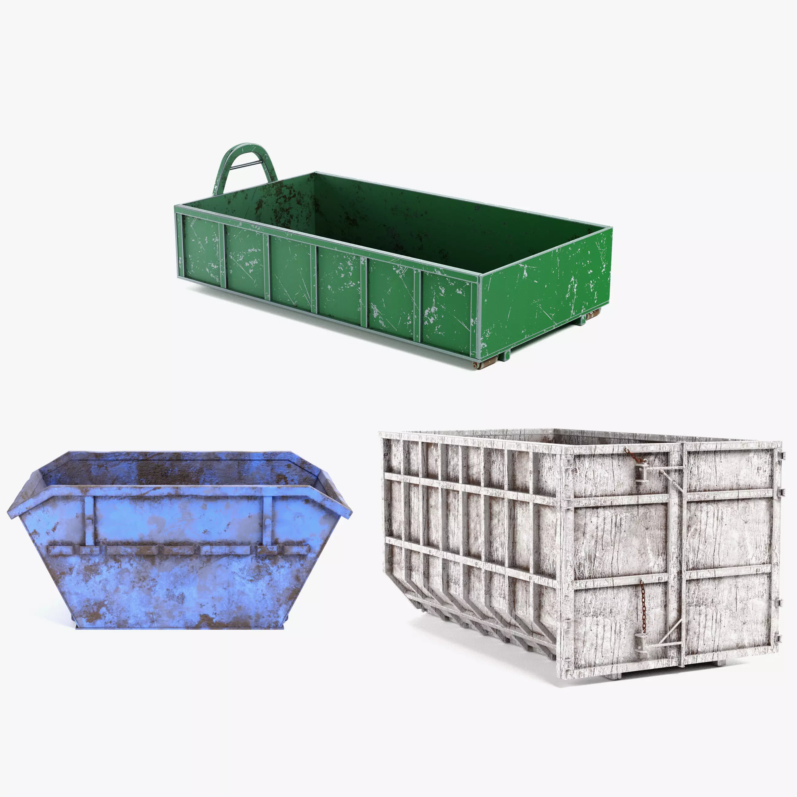 A collection of three industrial skip containers representing commonly used construction and waste-handling forms. Each model features a distinct container shape and proportion, unified by a weathered, heavily used appearance. Surface details include dirt buildup, scratches, chipped paint, and structural wear that give the assets a realistic presence suited for urban, industrial, and construction-focused scenes.