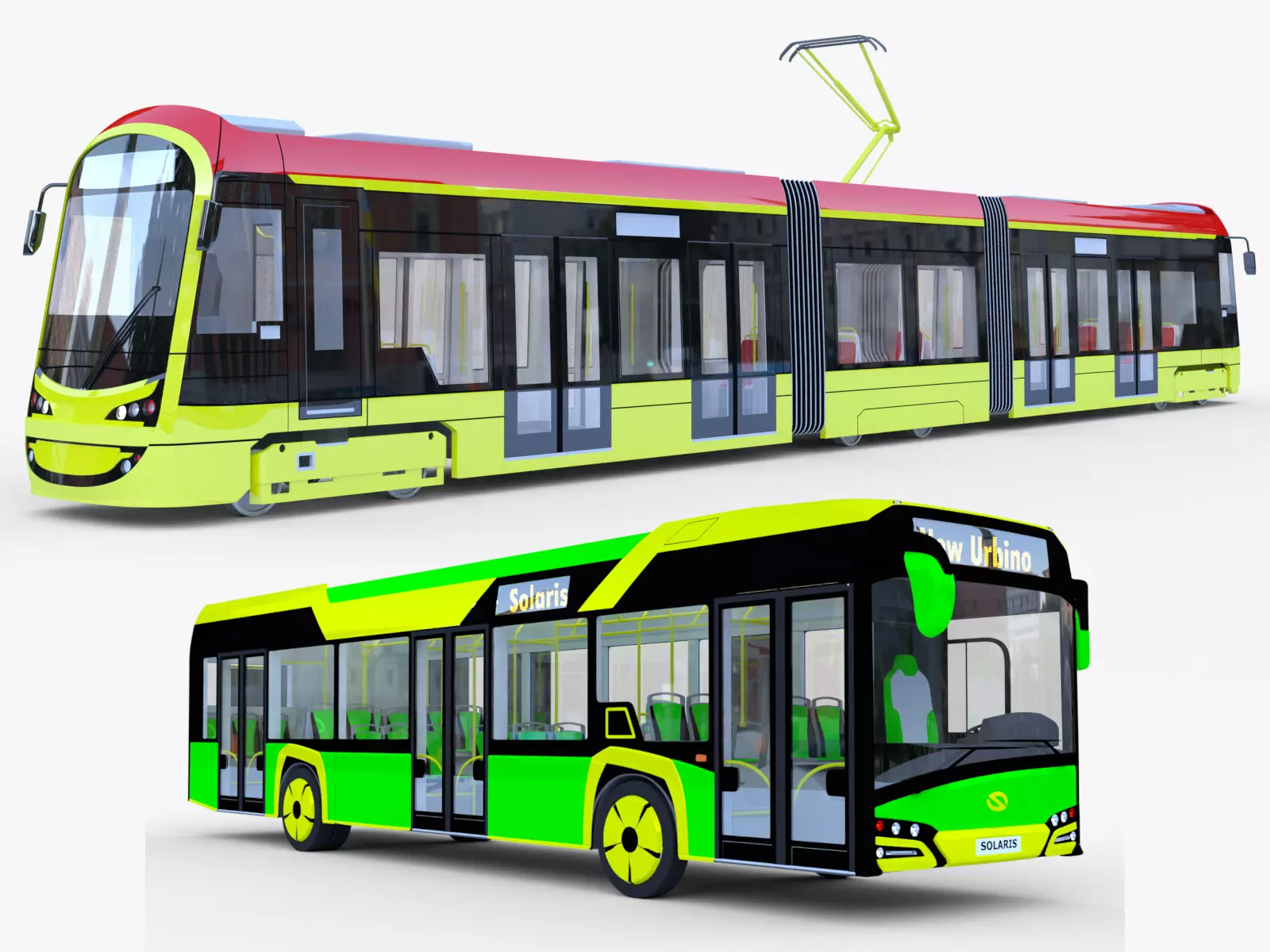 These are 3D models of Warsaw tram Hyundai Rotem and city bus Solaris Urbino.